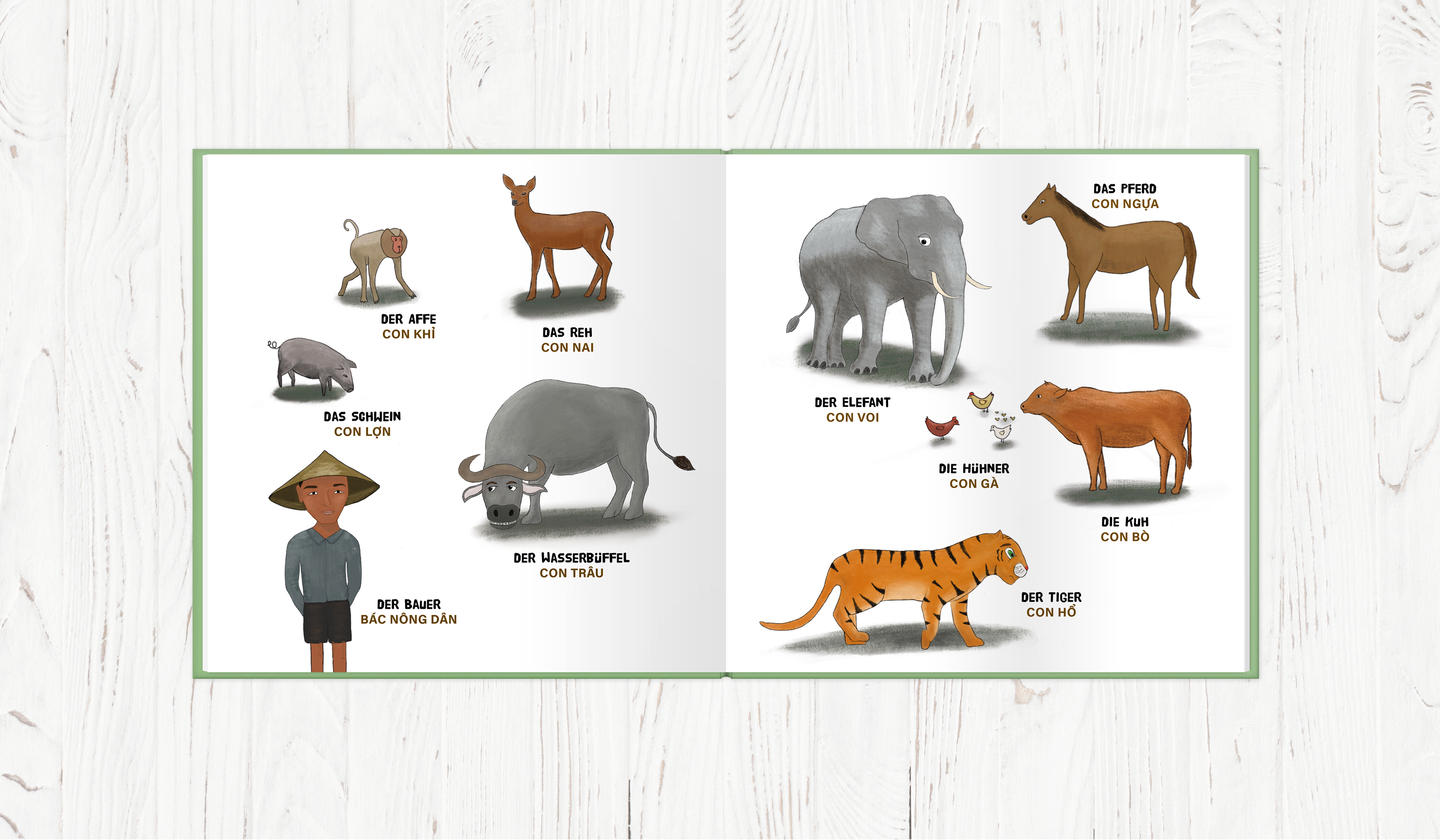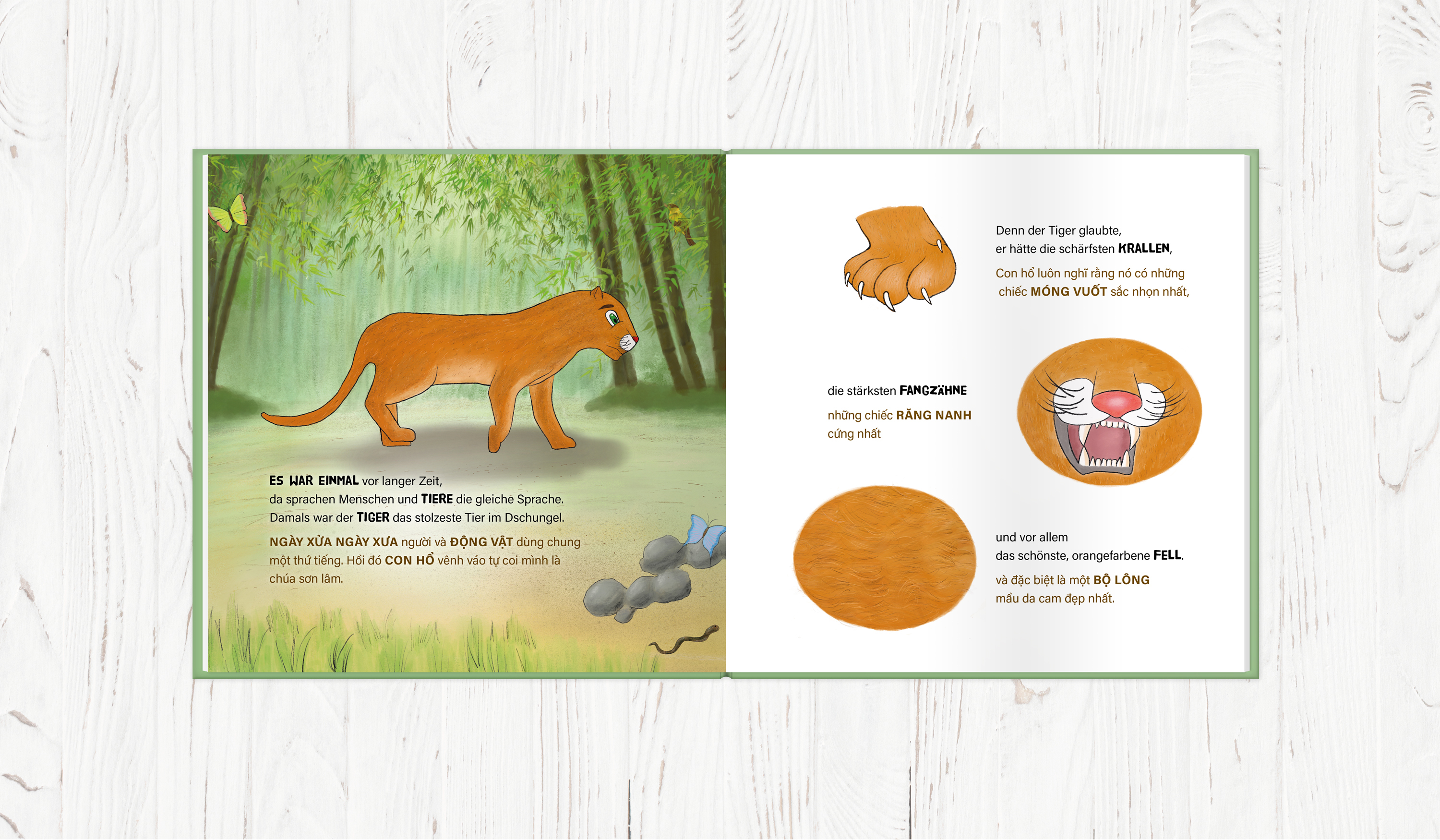 Weißt du, wie der Tiger seine Streifen bekam? Warum hat der Wasserbüffel keine oberen Zähne? Und was hat der Mensch damit zu tun? Dieses zweisprachige Buch lädt ein, das alte traditionelle vietnamesische Märchen Der Wasserbüffel, der Tiger und der Bauer kennen...