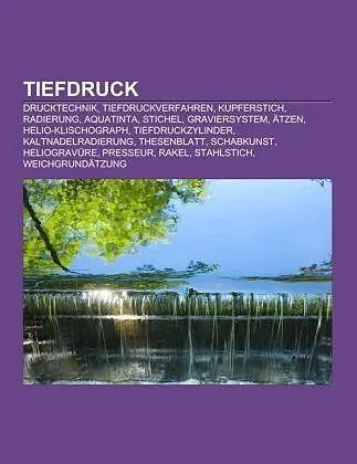 Quelle: Wikipedia. Seiten: 35. Kapitel: Drucktechnik, Tiefdruckverfahren, Kupferstich, Radierung, Aquatinta, Stichel, Graviersystem, Ätzen, Helio-Klischograph, Tiefdruckzylinder, Kaltnadelradierung, Thesenblatt, Schabkunst, Heliogravüre, Presseur, Rakel, Stahl...