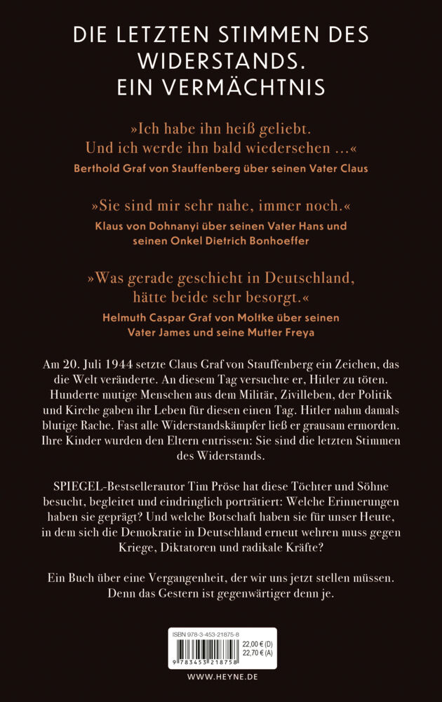 Am 20. Juli 1944 setzte Claus Graf von Stauffenberg ein Zeichen, das die Welt veränderte. An diesem Tag versuchte er, Hitler zu töten. Hunderte mutige Menschen aus dem Militär, Zivilleben, der Politik und Kirche gaben ihr Leben für diesen einen Tag. Hitler nahm damals blutige Rache. Fast alle Widerstandskämpfer ließ er grausam ermorden. Ihre Kinder wurden den Eltern entrissen: Sie sind die letzten Stimmen des Widerstands. SPIEGEL-Bestsellerautor Tim Pröse hat diese Töchter und Söhne besucht, begleitet und ihnen zugehört: Welche Erinnerungen haben sie geprägt? Und welche Botschaft haben sie für unser Heute, in dem sich die Demokratie in Deutschland erneut wehren muss gegen Kriege, Diktatoren und radikale Kräfte? Ein Buch über eine Vergangenheit, der wir uns jetzt stellen müssen. Denn das Gestern ist gegenwärtiger denn je. »Ich werde ihn bald wiedersehen.« So gedenkt Berthold Schenk Graf von Stauffenberg heute des Vaters, den er als Junge zum letzten Mal sah. Er und viele weitere Söhne und Töchter der Widerstandskämpfer des 20. Juli, so etwa Klaus von Dohnanyi, Carl Goerdeler, Helmtrud von Hagen, Helmuth Caspar Graf von Moltke und viele andere lassen ihre Erinnerungen, Ideale und Hoffnungen in Tim Pröses eindringlichen Porträts aufleben. »Ich habe ihn heiß geliebt. Und ich werde ihn bald wiedersehen « (Berthold Graf von Stauffenberg über seinen Vater Claus) »Sie sind mir sehr nahe, immer noch.« (Klaus von Dohnanyi über seinen Vater Hans und seinen Onkel Dietrich Bonhoeffer) »Was gerade geschieht in Deutschland, hätte beide sehr besorgt.« (Helmuth Caspar Graf von Moltke über seinen Vater James und seine Mutter Freya)