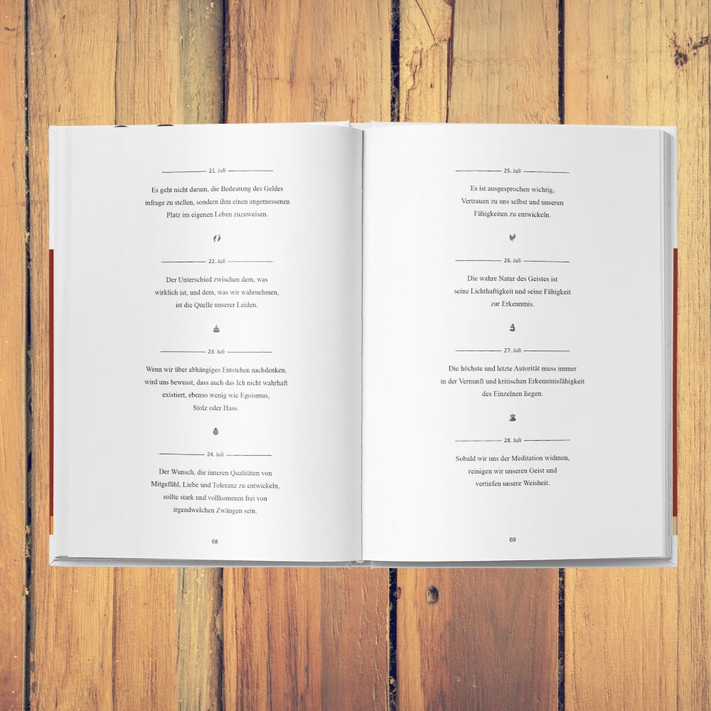 Tenzin Gyatso ist der 14. Dalai Lama und das Oberhaupt des tibetischen Buddhismus. Von ihm und seinen geistigen Vorgängern stammen die 365 Zitate aus diesem Buch. Um genau zu sein, habe ich 365 inspirierende Lebensweisheiten des Dalai Lama für dich recherchiert, übersetzt und aufbereitet, mit deren Hilfe du jeden Tag bewusster und glücklicher leben kannst.