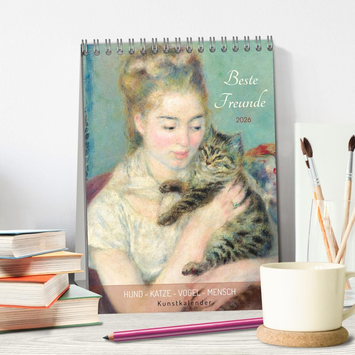 Beste Freunde Hund - Katze - Vogel - Mensch Kunstkalender (Tischkalender 2026 DIN A5 hoch), CALVENDO Monatskalender