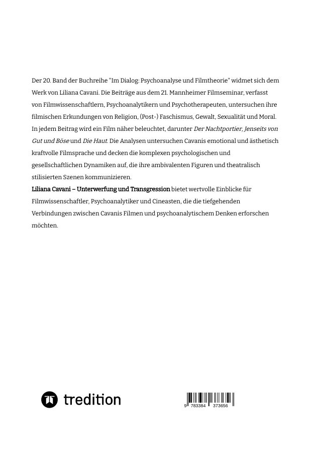Der 20. Band der Buchreihe "Im Dialog: Psychoanalyse und Filmtheorie" widmet sich dem Werk von Liliana Cavani. Die Beiträge aus dem 21. Mannheimer Filmseminar, verfasst von Filmwissenschaftlern, Psychoanalytikern und Psychotherapeuten, untersuchen ihre filmisc...