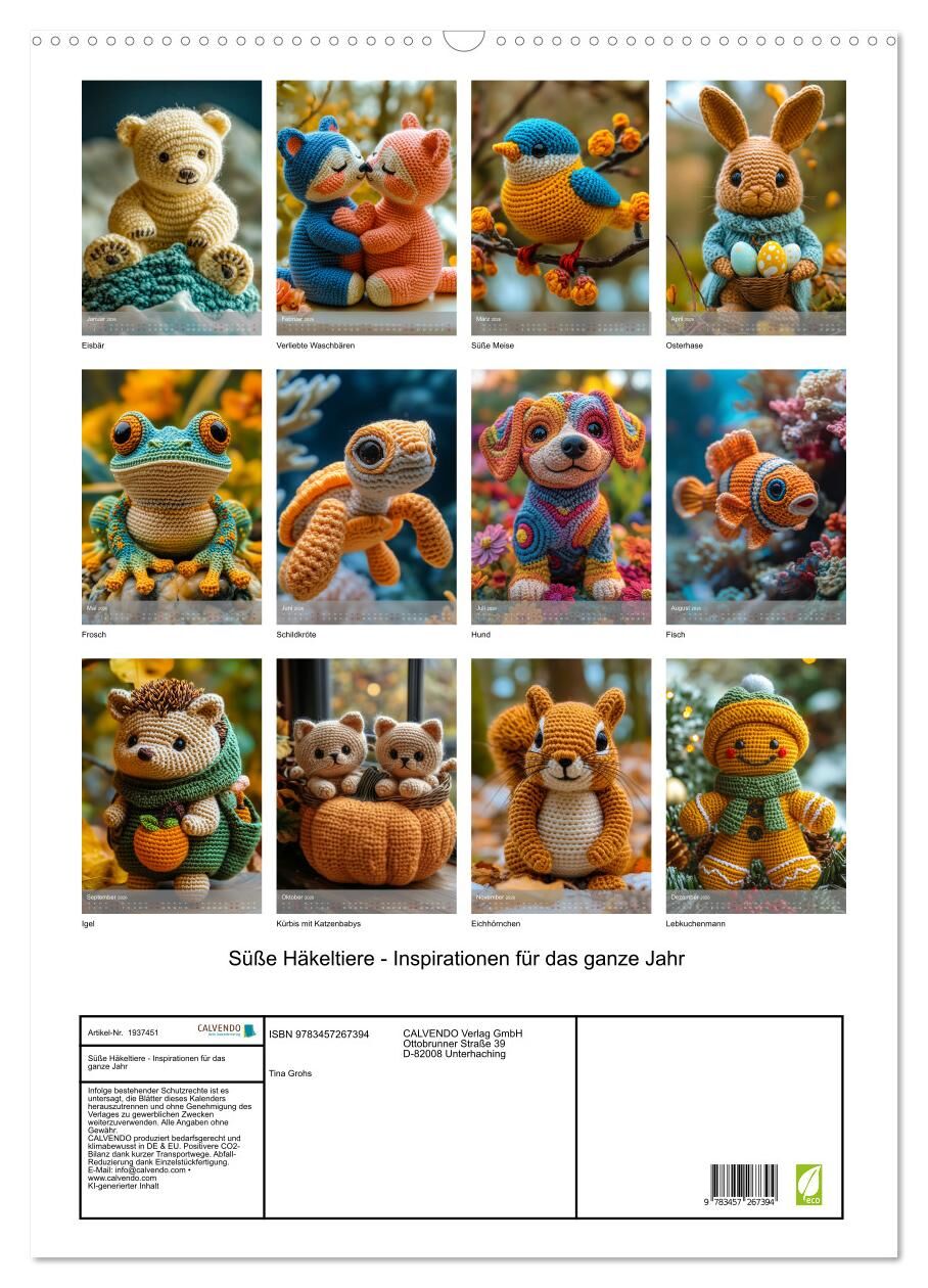 Tauchen Sie ein in die zauberhafte Welt der Häkelkunst! Dieser mit modernsten KI Tools erstellte Wandkalender begleitet Sie mit handverlesenen Motiven von niedlicher Häkeltiere durch die Jahreszeiten. Ob ein kuscheliger Eisbär im Winter, ein fröhlicher Frosch ...