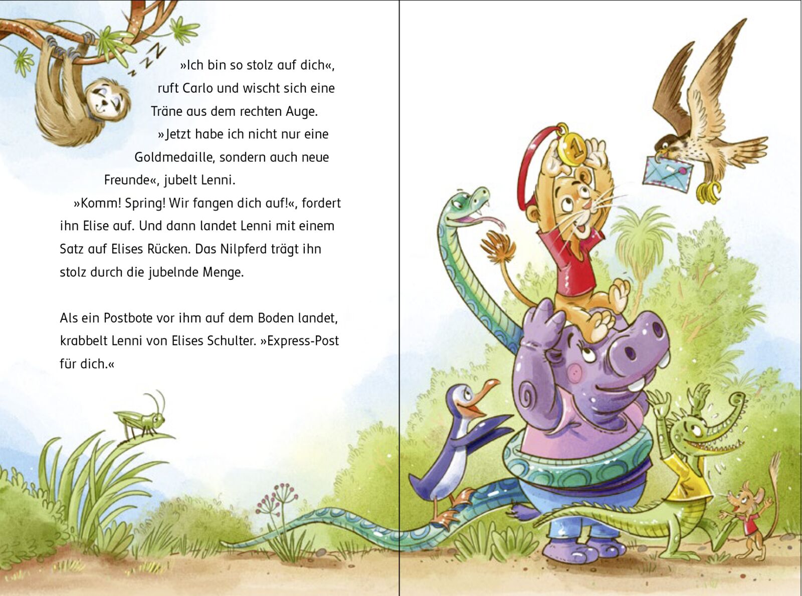 Am liebsten würde der kleine Löwe Lenni seine Hängematte nie verlassen. Doch als sein Papa sich verletzt, landet Lenni hopplahopp als Vertretung bei der Olympiade der Tiere. Dort soll er gegen Antilope Regina im 103-Meter-Lauf antreten und die Löwenehre rette...
