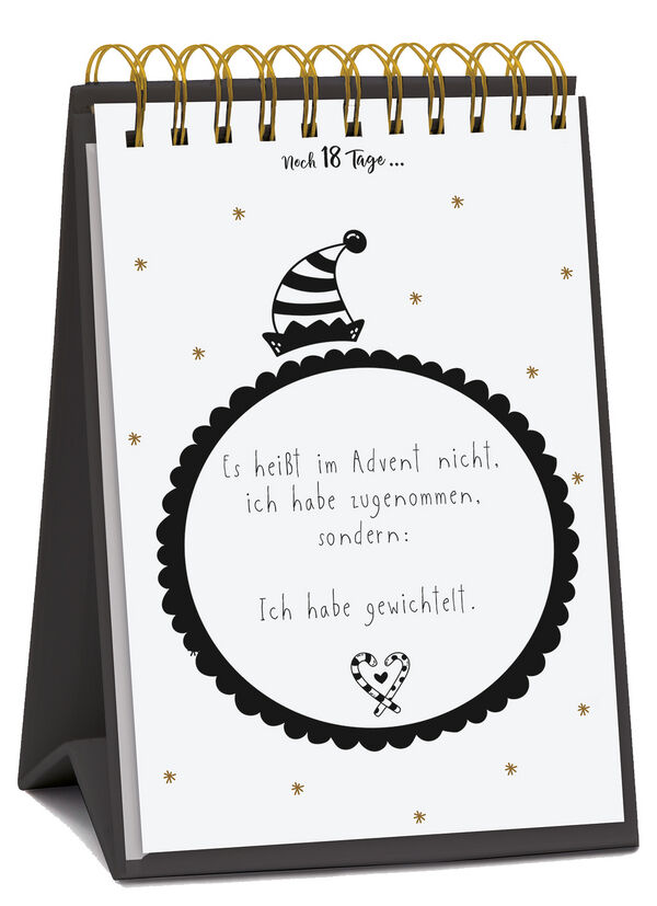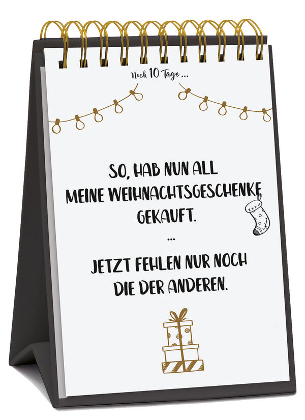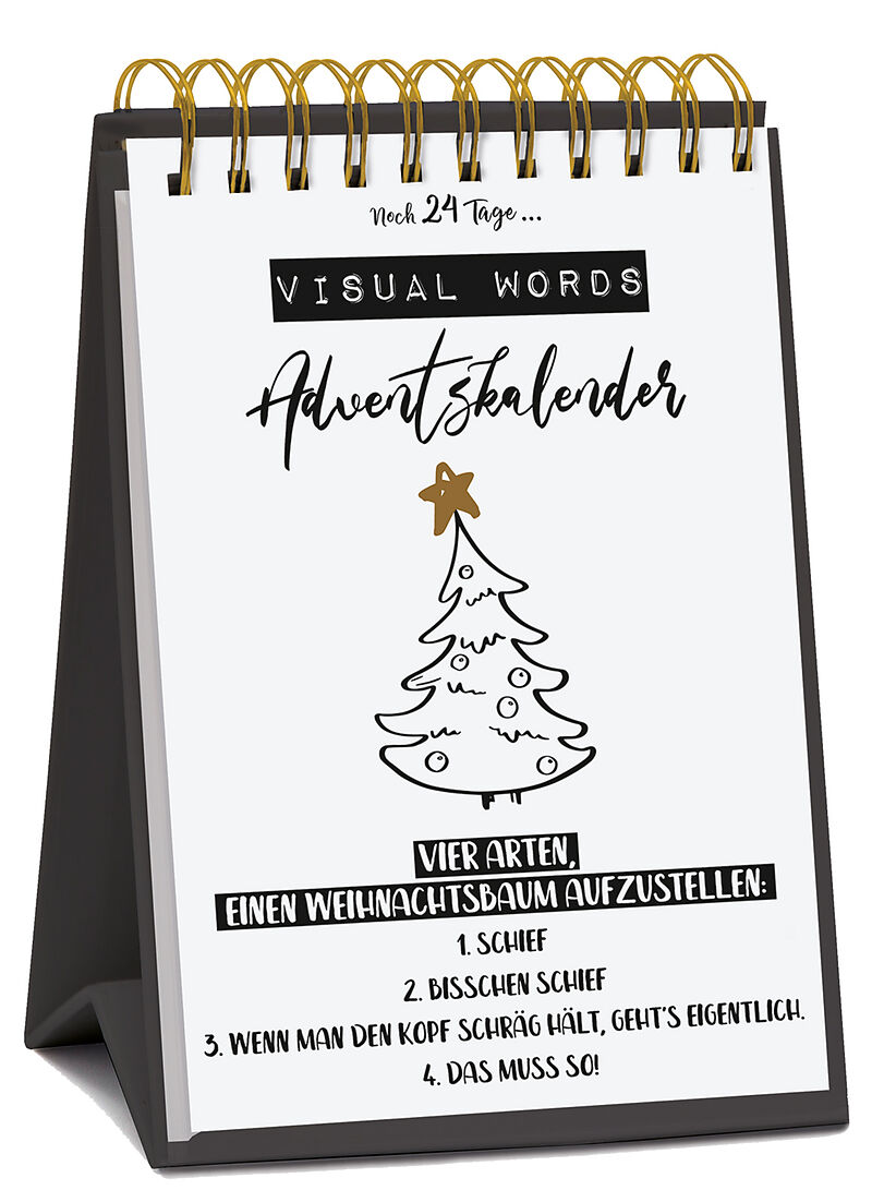 Produktmerkmale Tisch-Adventskalender zum Aufstellen 24 Karten zum Abtrennen, Sammeln und Versenden mit Golddruck auf FSC-zertifiziertem Karton gedruckt Visual Words 24 lustige Sprüche und coole Statements im Typo-Art-Design dieser Postkarten-Adventskalender ...