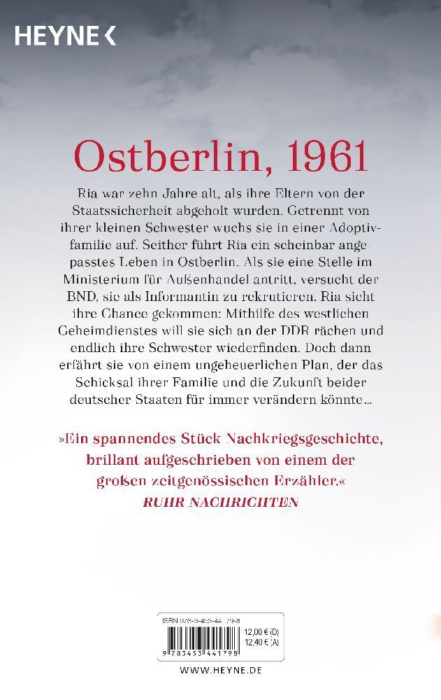 Ria ist zehn Jahre alt, als ihre Eltern von der Staatssicherheit abgeholt werden. Sie wird von ihrer kleinen Schwester getrennt und in einer Adoptivfamilie untergebracht. Seither führt Ria in Ostberlin ein scheinbar angepasstes Leben. Erst als der BND sie als ...