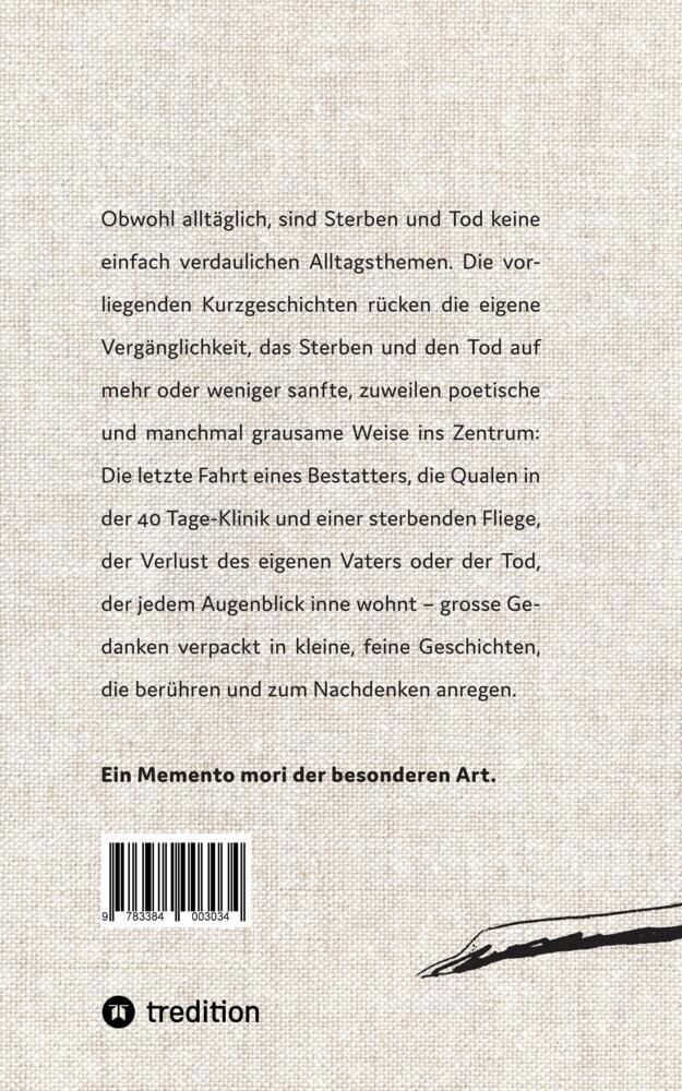 Obwohl alltäglich, sind Sterben und Tod keine einfach verdaulichen Alltagsthemen. Die vorliegenden Kurzgeschichten rücken die eigene Vergänglichkeit, das Sterben und den Tod auf mehr oder weniger sanfte, zuweilen poetische und manchmal grausame Weise ins Zentr...