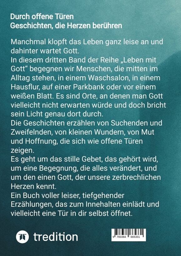 Christliche Erzählungen für Herz und Seele (Band 3 der Reihe) Es gibt Türen, die sich leise öffnen. Türen, die nicht aus Holz oder Stahl bestehen, sondern aus Worten, Begegnungen, aus einem Augenblick, der unser Herz berührt. Genau solche Türen stehen im Mitte...