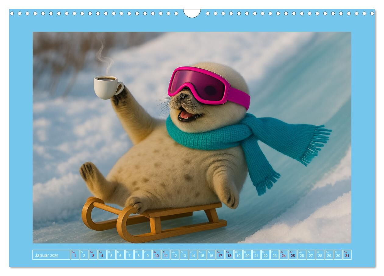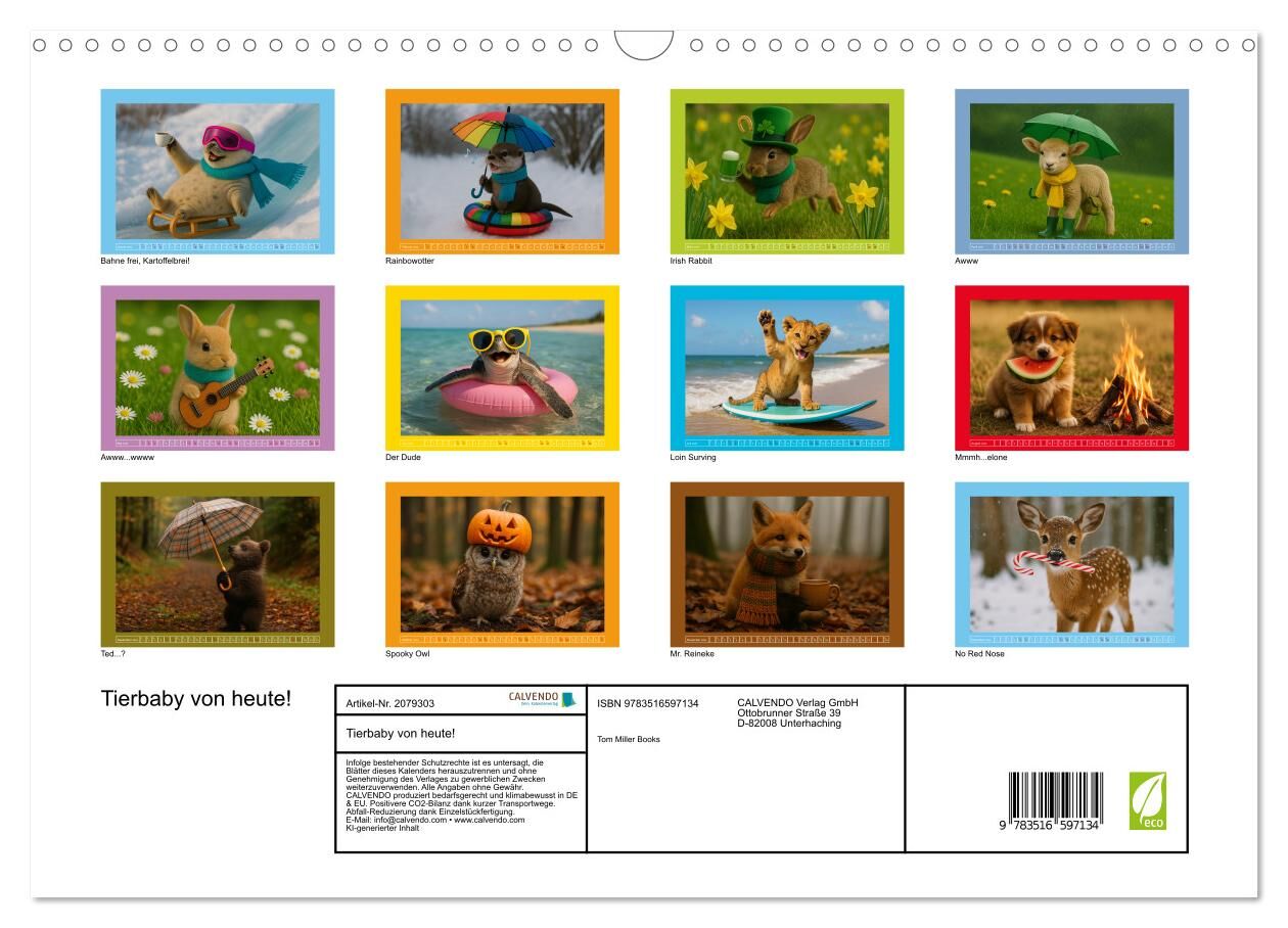 Entdecke den tierisch süßen Kalender des Jahres! Jeder Monat begrüßt dich mit einem unwiderstehlichen Tierbaby in Fotoqualität mal frech, mal verträumt, aber immer mit einem absurden Twist, der dir ein Lächeln ins Gesicht zaubert. Ob Robbe auf dem Schlitten, H...