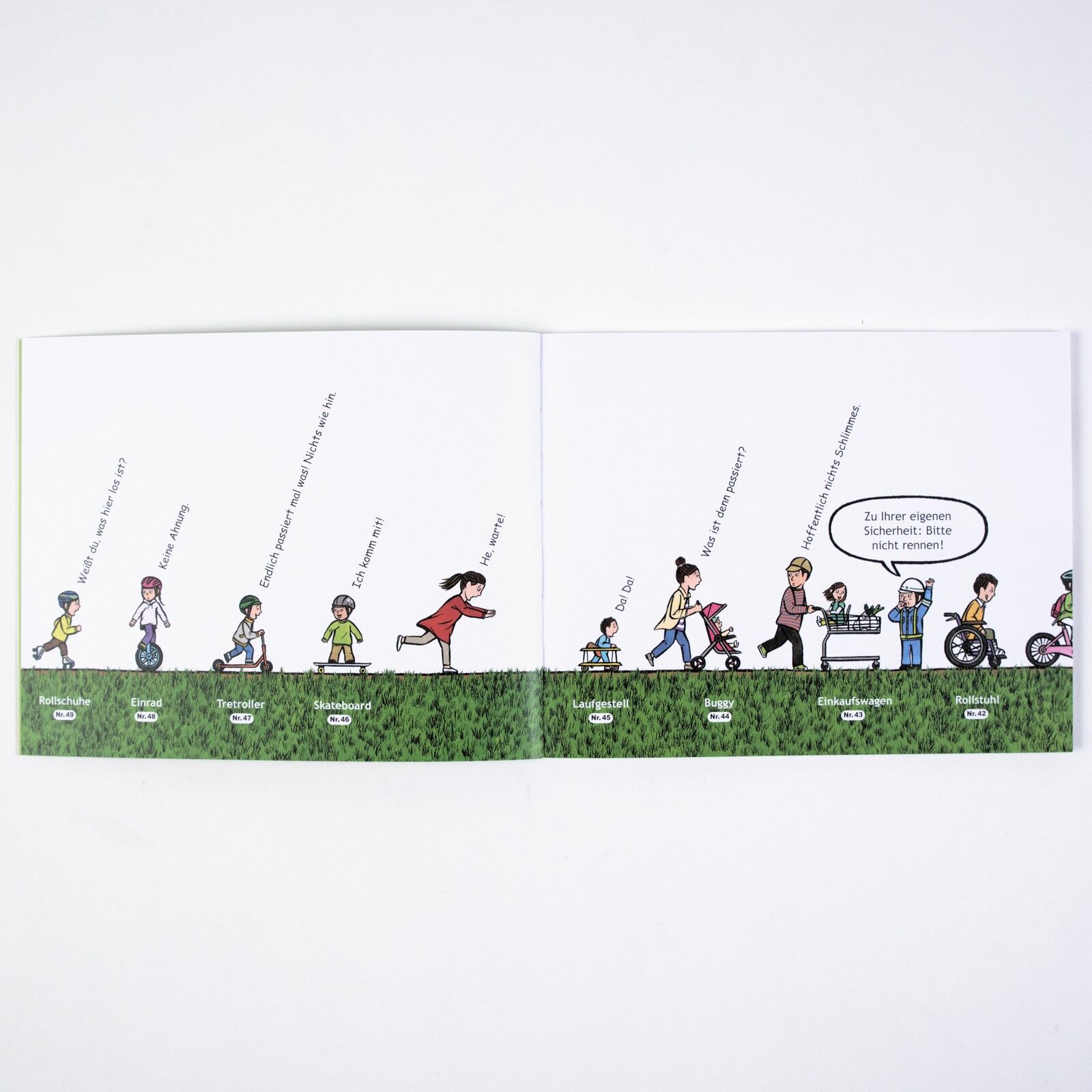 Plötzlich stecken alle im Riesenstau. "Was ist da vorne los?", ruft ein kleiner Junge auf seinem Dreirad. Da der Straßenarbeiter es nicht weiß, machen sie sich auf den Weg: mit Einrad, Tretroller, Skateboard, auf Rollschuhen, im Buggy und im Rollstuhl. Wir ler...
