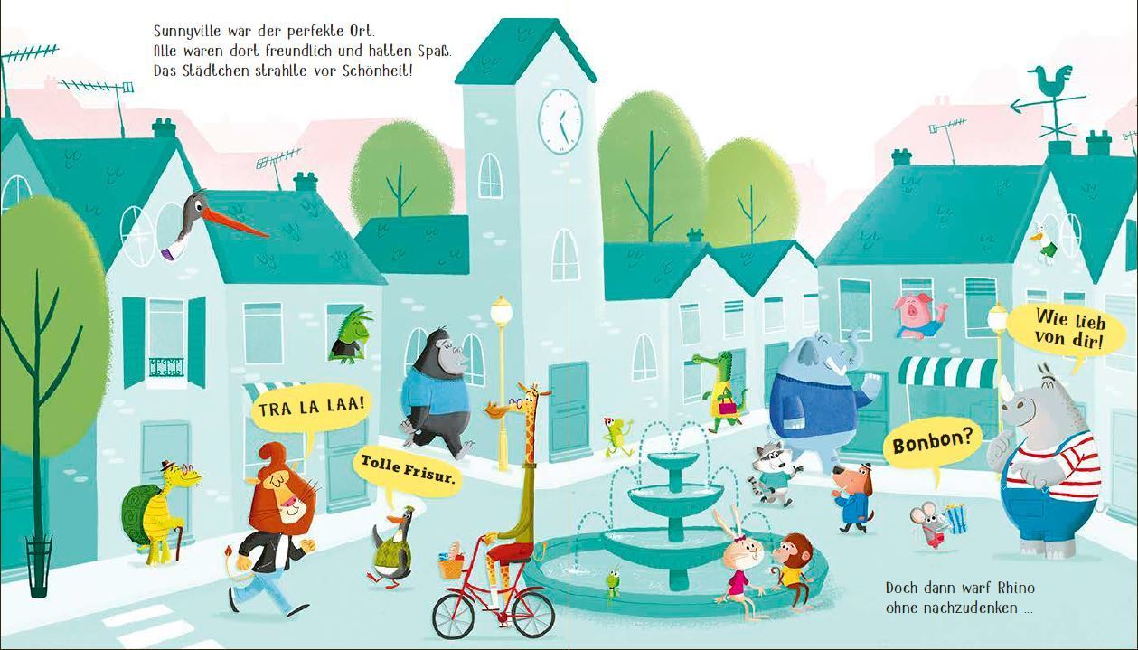 In Sunnyville ist es sauber, schön und ordentlich. Jedes Tier ist willkommen und alle fühlen sich wohl. Bis Rhino ein Bonbonpapier auf den Boden wirft! Macht doch nix!?, denkt er sich. Ist ja nur eins. Aber was passiert, wenn jeder so denkt? Schon bald wird es...