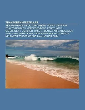 Quelle: Wikipedia. Seiten: 51. Kapitel: Reformwerke Wels, John Deere, Volvo, Liste von Traktormarken, Mercedes-Benz, Fendt, Köppl, Caterpillar, Gutbrod, Case IH, Deutz-Fahr, AGCO, Iseki Noki, SAME Deutz-Fahr, Motorenfabrik Hatz, Ursus, Neumayer Tekfor Group, M...