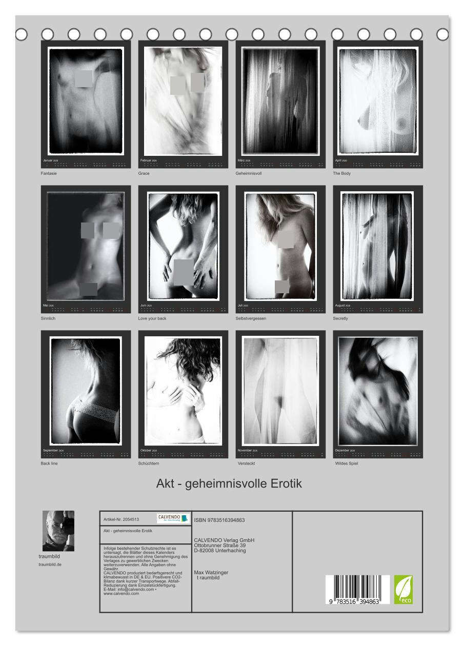 Der Kalender zeigt 12 künstlerische- ästhetische Aktfotografien, die der Fantasien des Betrachters freien Raum lässt und die Sinne anregt.