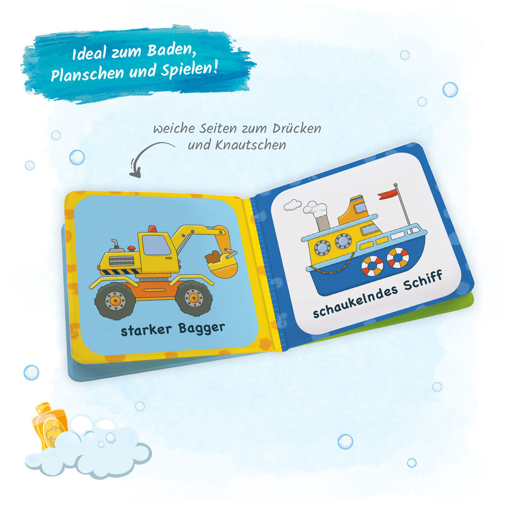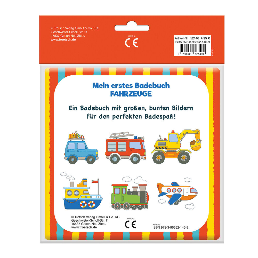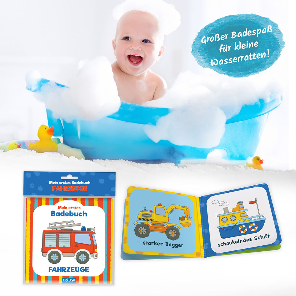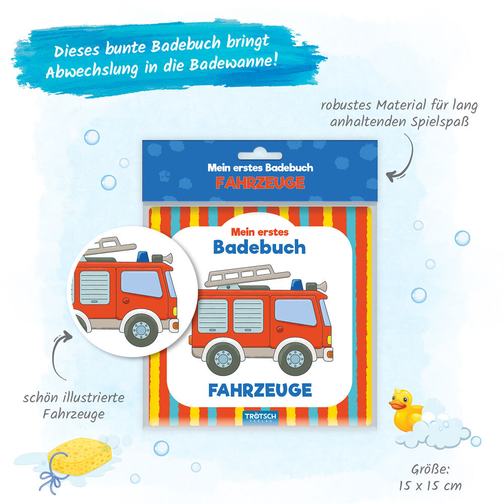 TRÖTSCH - Badebuch "Fahrzeuge" | Wasserfestes Badebuch mit liebevoll illustrierten Fahrzeugmotiven. Leuchtend buntes Badewannenbuch mit weichen Oberflächen zum Drücken und Knautschen | Ab 0 Monaten