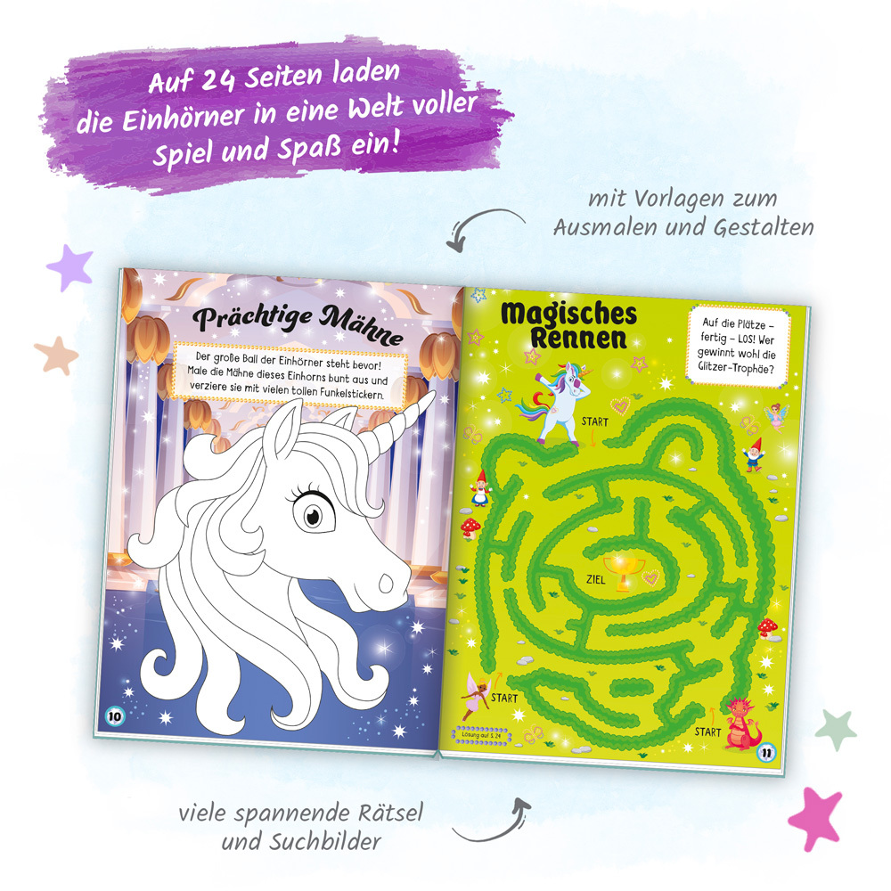 Mit den liebsten Stiften ausgestattet, entführen die Einhörner kleine Künstler in ihre magische Welt voller Spiel und Spaß! Spannende Rätsel, bunte Basteleien und lustige Spiele sorgen dabei für viel Abwechslung. Egal ob zuhause oder unterwegs, mit diesem zaub...