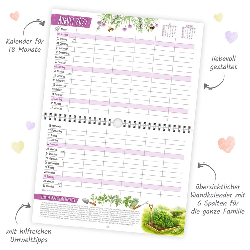 Der Wandkalender mit 6 Spalten für die ganze Familie zeigt alles wichtige auf einen Blick! Mit seinem übersichtlichem Kalendarium für 18 Monate und Platz für Erinnerungen, Termine und Notizen ist dieser Familienterminer ein unverzichtbarer Alltagshelfer. Der u...