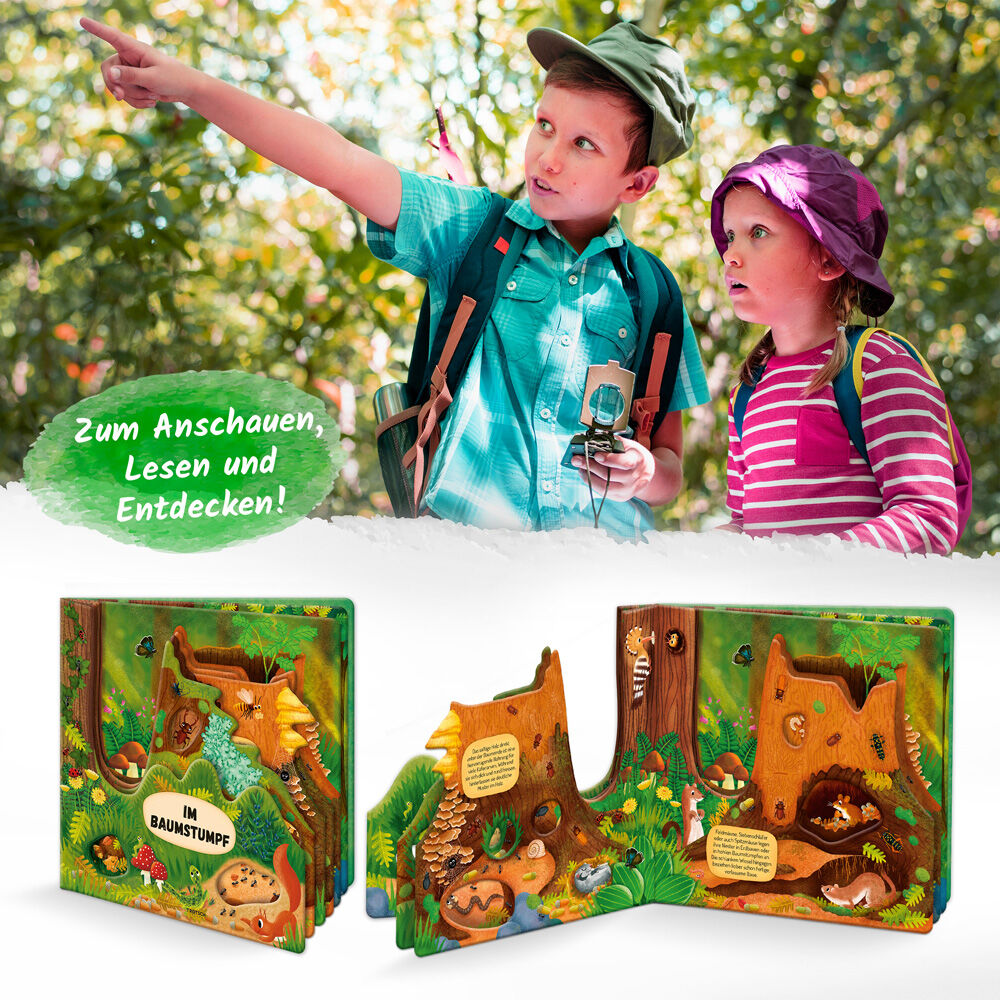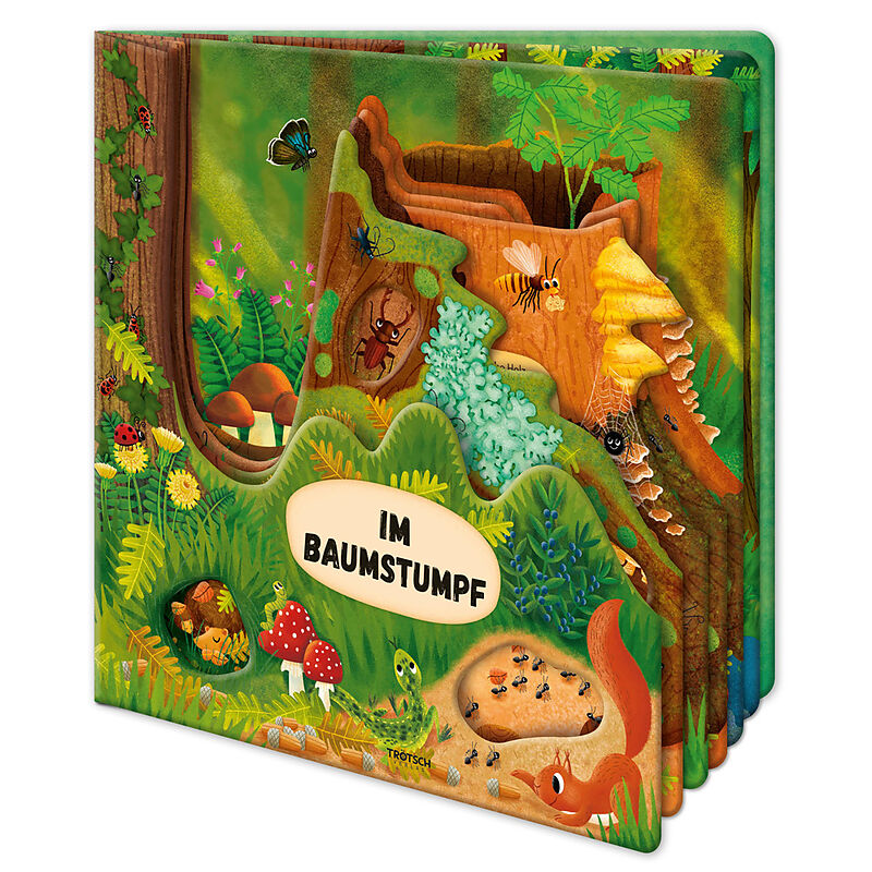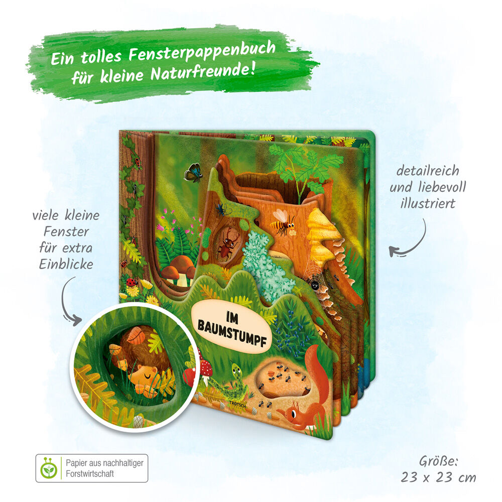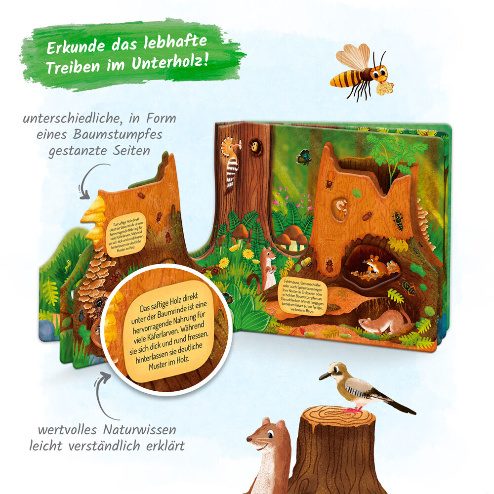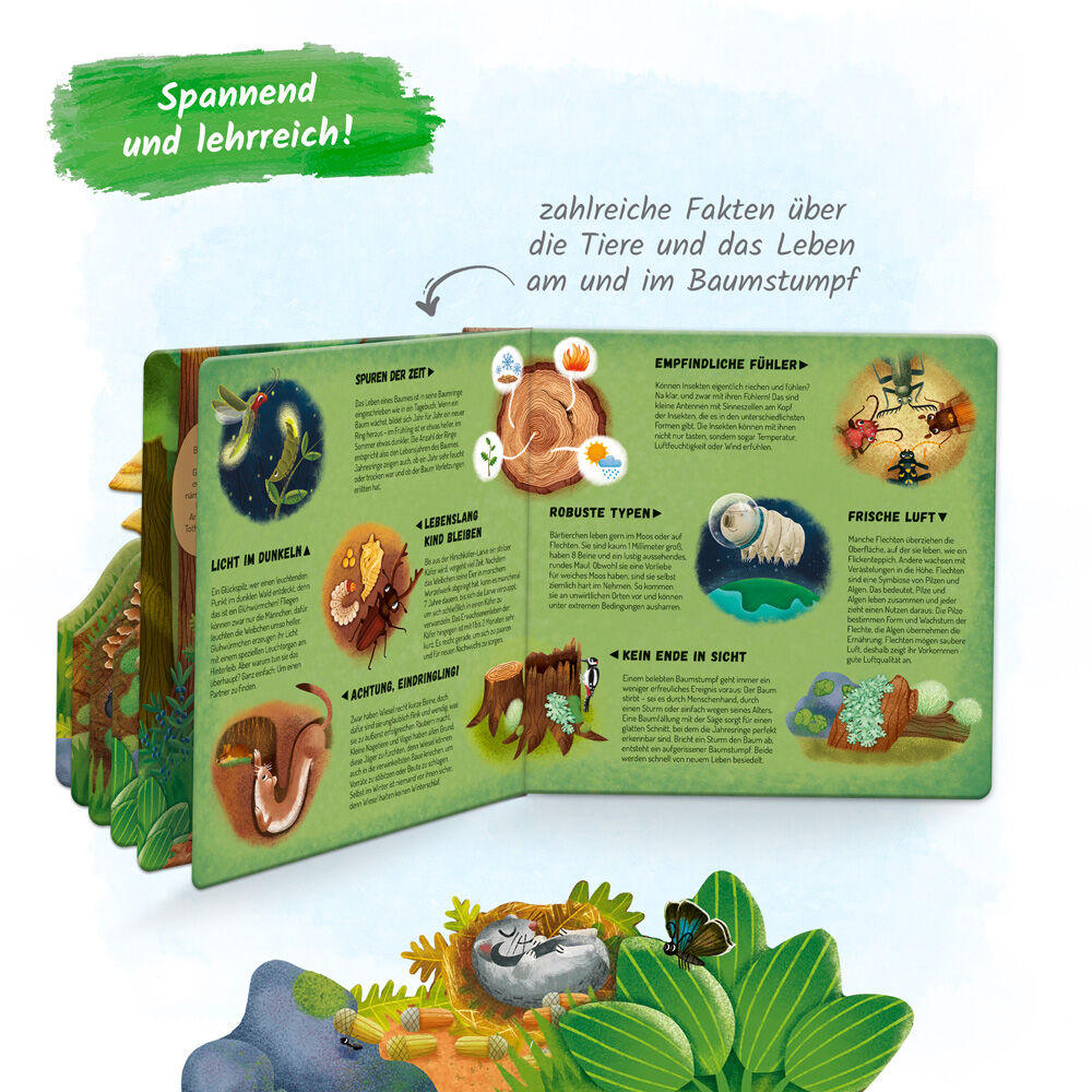 Mit diesem detailreich und liebevoll gestalteten Fensterbuch können Kinder das Leben in einem abgestorbenen Baumstumpf erkunden. Die vorderen Seiten sind in Form gestanzt so tauchen die kleinen Entdecker mit jeder Seite tiefer ins Innere eines Baumstumpfes ein...
