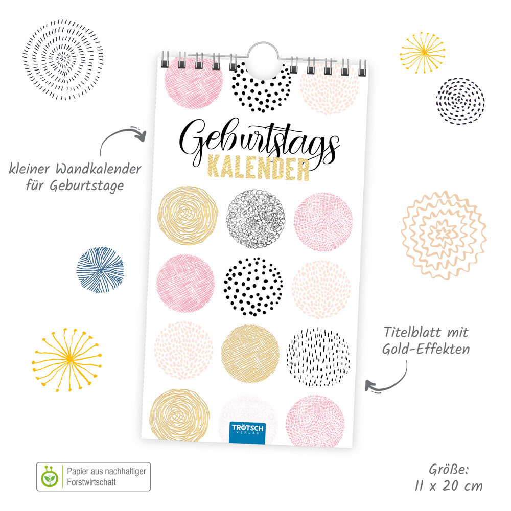 In diesem zeitlos gestalteten Wandkalender sind die Geburtstage von Familienangehörigen, Verwandten, Freunden und Arbeitskollegen sicher notiert und werden garantiert nicht mehr vergessen. Die Monatsblätter sind jahresunabhängig, so kann der Kalender in jedem ...