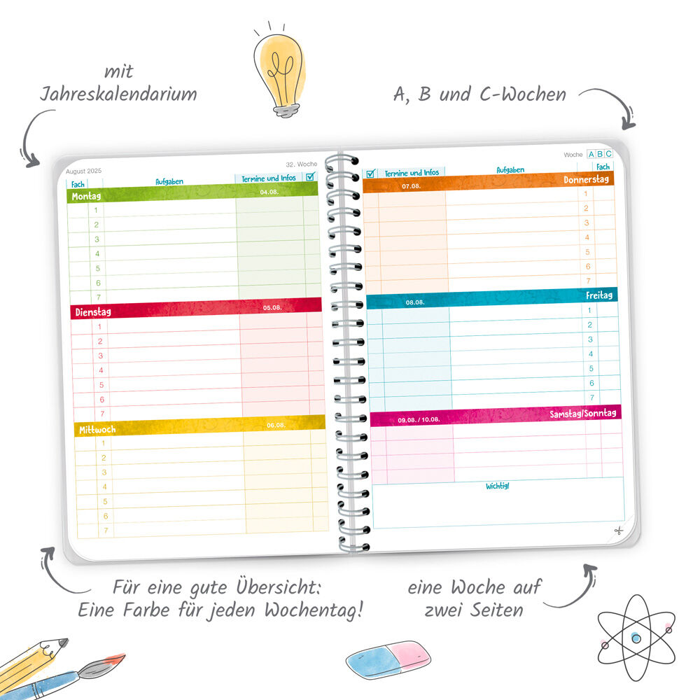 Der Grundschulplaner ist speziell auf die Bedürfnisse der Schüler und Schülerinnen in Klasse 1 bis 4 abgestimmt. Jeder Wochentag hat seine eigene Farbe und kann somit schnell gefunden werden, um die Hausaufgaben einzutragen. Format: A5, 128 Seiten, eine Woche ...