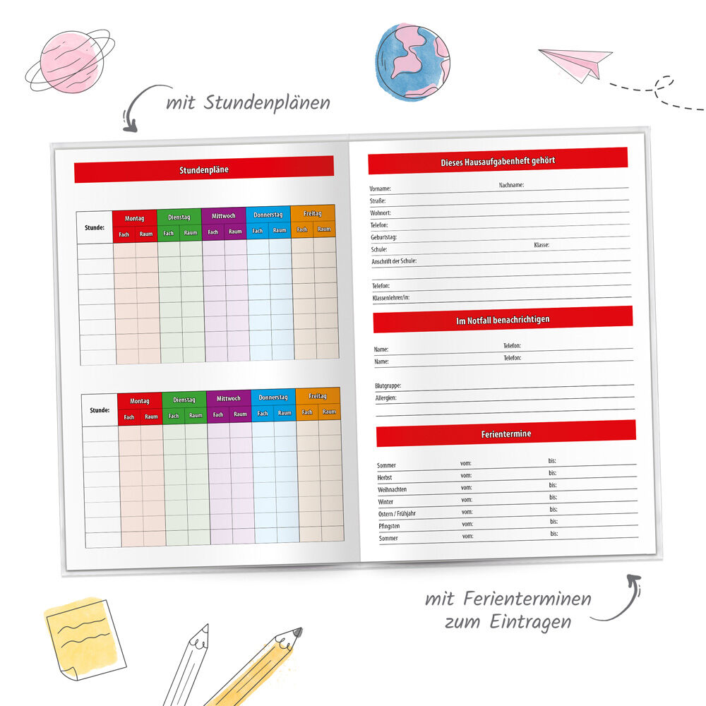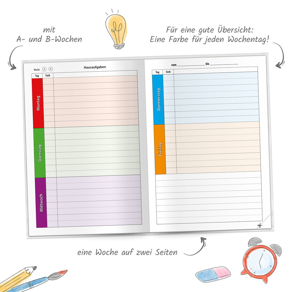 Das Hausaufgabenheft ist speziell auf die Bedürfnisse der Schüler und Schülerinnen in Klasse 1 bis 4 abgestimmt. Jeder Wochentag hat seine eigene Farbe und kann somit schnell gefunden werden, um die Hausaufgaben einzutragen. Format: A5, 96 Seiten, eine Woche a...