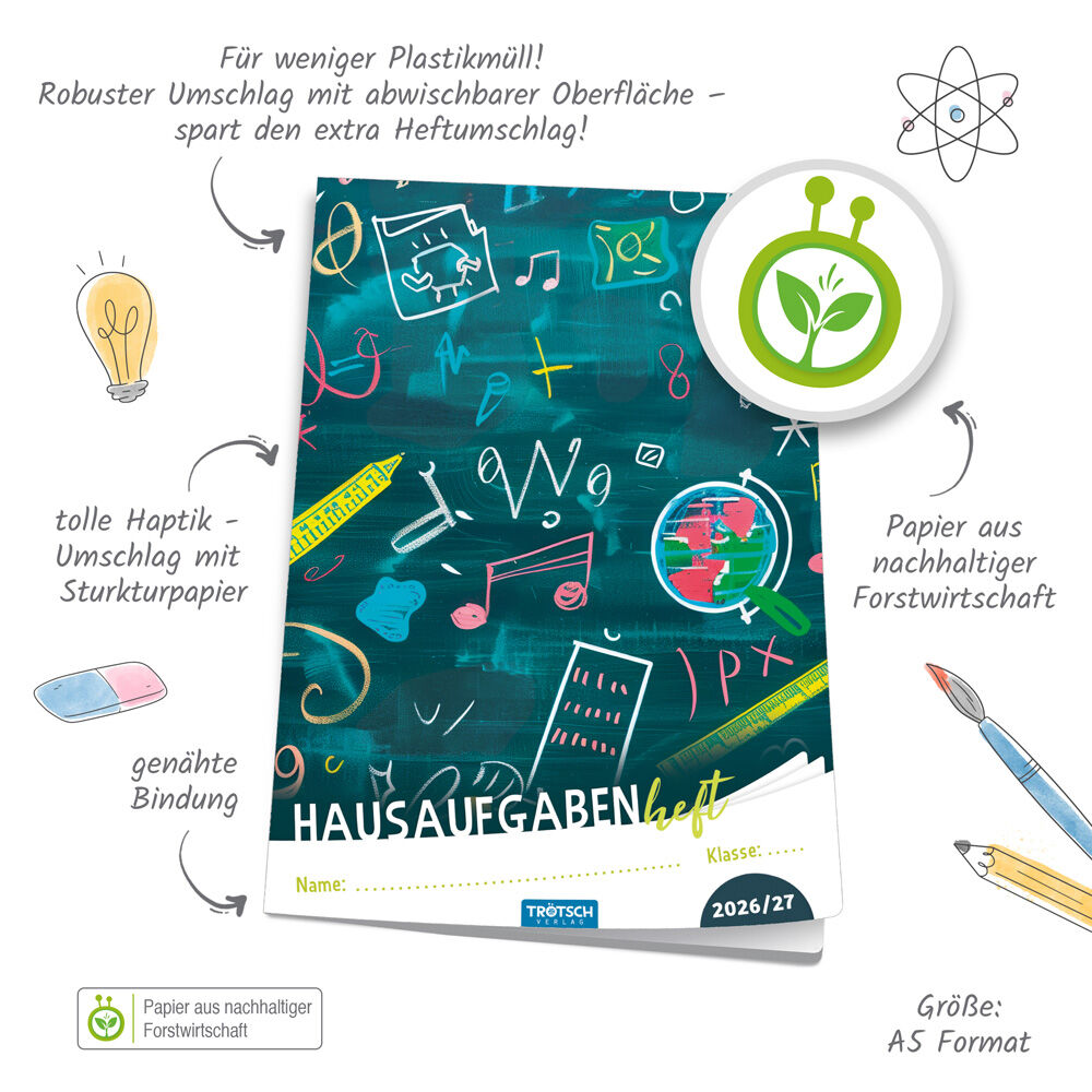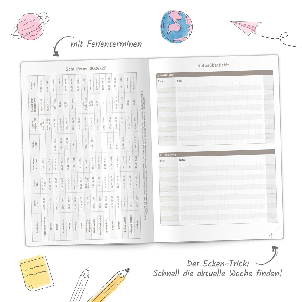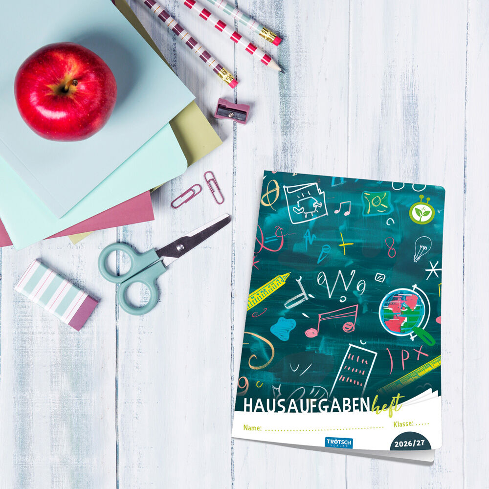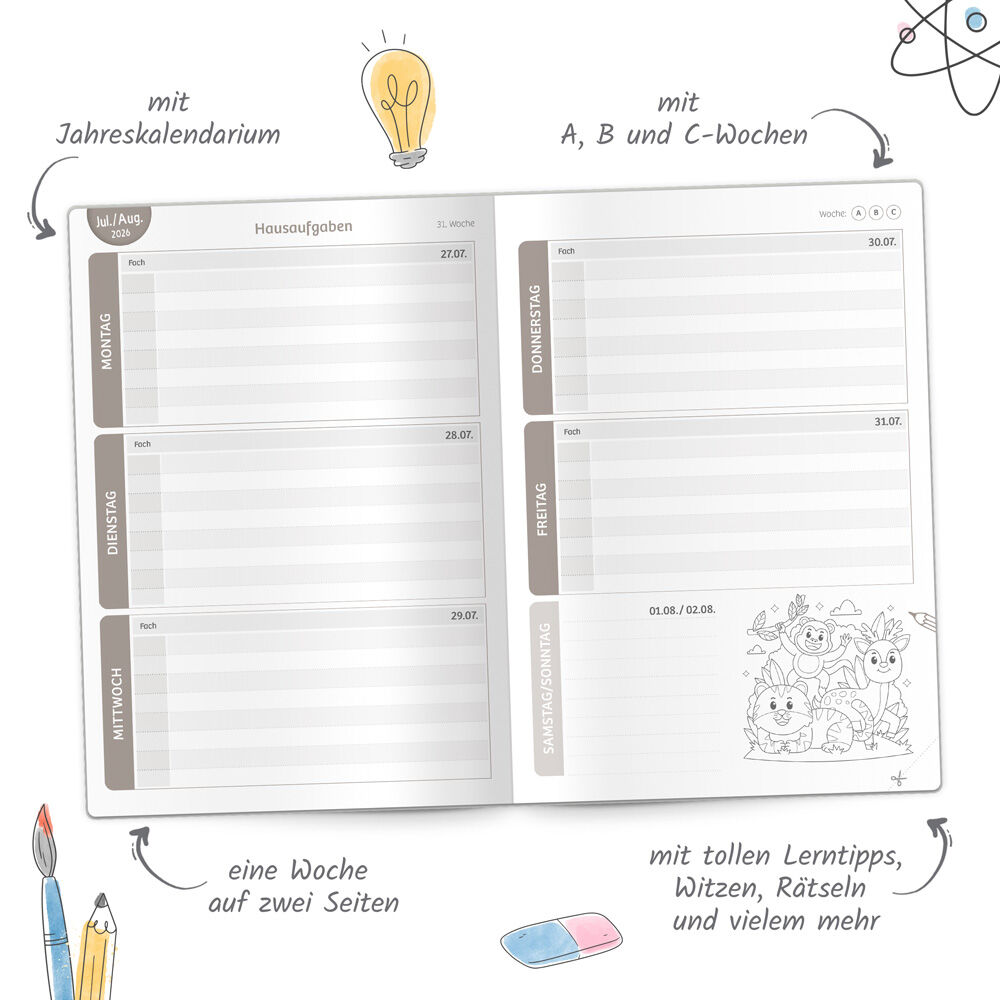 Jahresbezogenes Hausaufgabenheft im Format A5 für das Schuljahr 2026/27 mit 112 Seiten. Eine Woche wird auf zwei Seiten dargestellt, so dass ausreichend Platz zum Eintragen vorhanden ist. Das Hausaufgabenheft hat A-, B-, C-Wochen mit Jahreskalendarium, Lerntip...