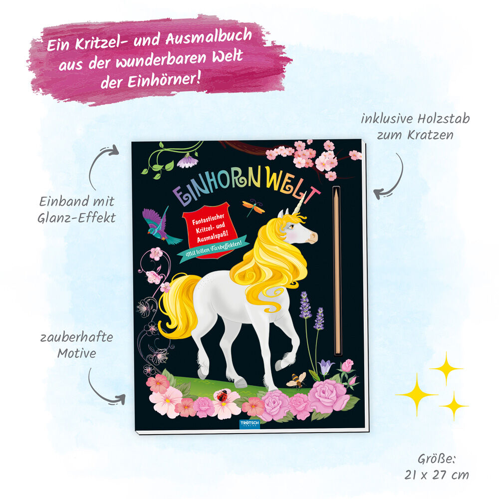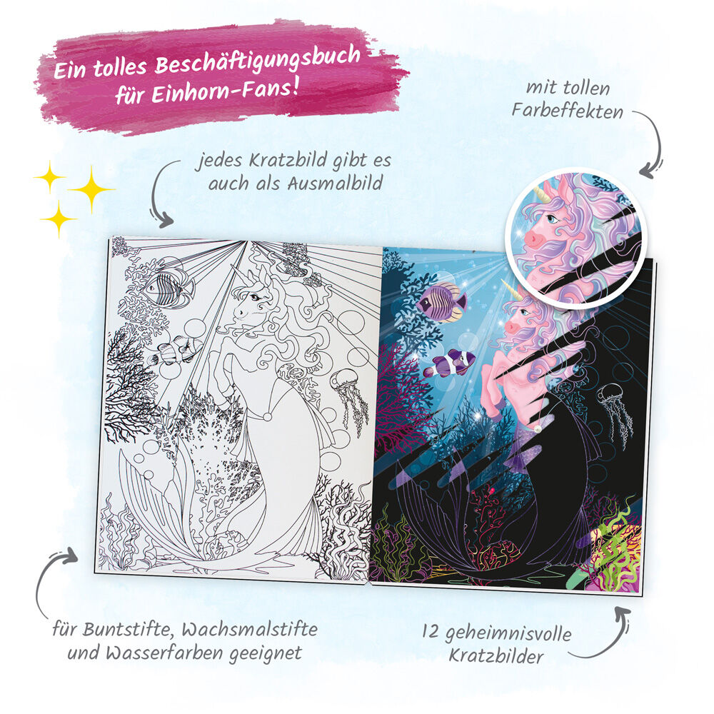 Magischer Kritzel- und Ausmalspaß aus der wunderbaren Welt der Einhörner! Beim Kratzen über die schwarzen Flächen entstehen fantastische Farbeffekte und zauberhafte Bilder. Jedes Kratzbild gibt es auch als Ausmalbild, das mit vielen bunten Stiften nach eigenen...