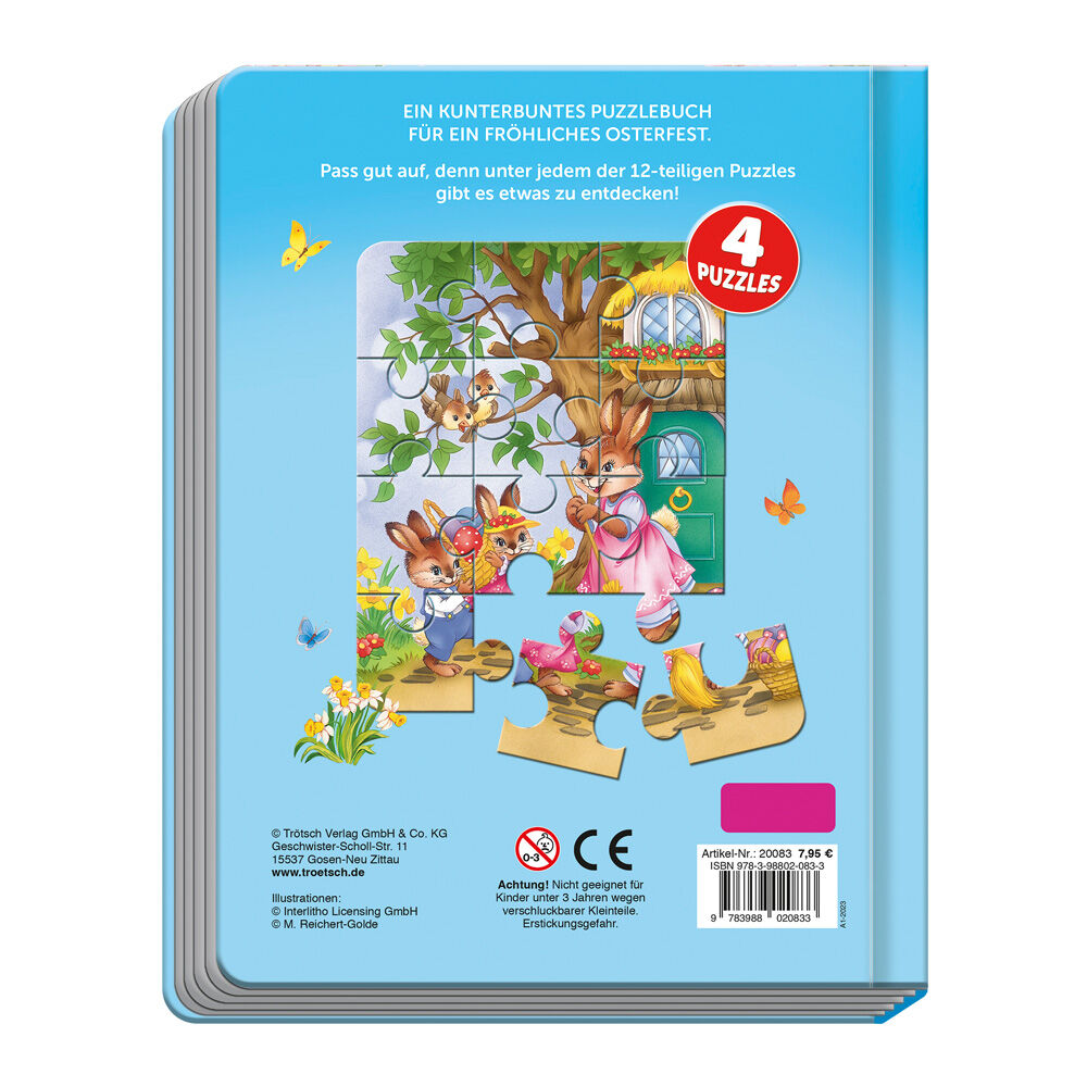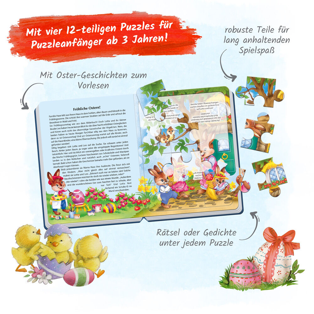 Dieses liebevoll gestaltete Puzzlebuch steckt voller Geschichten, Gedichte und vieles mehr für eine fröhliche Osterzeit! Die Puzzleteile sind robust und gut für kleine Puzzleanfänger ab 3 Jahren geeignet. Die Geschichten laden zum Träumen ein und unter jedem d...