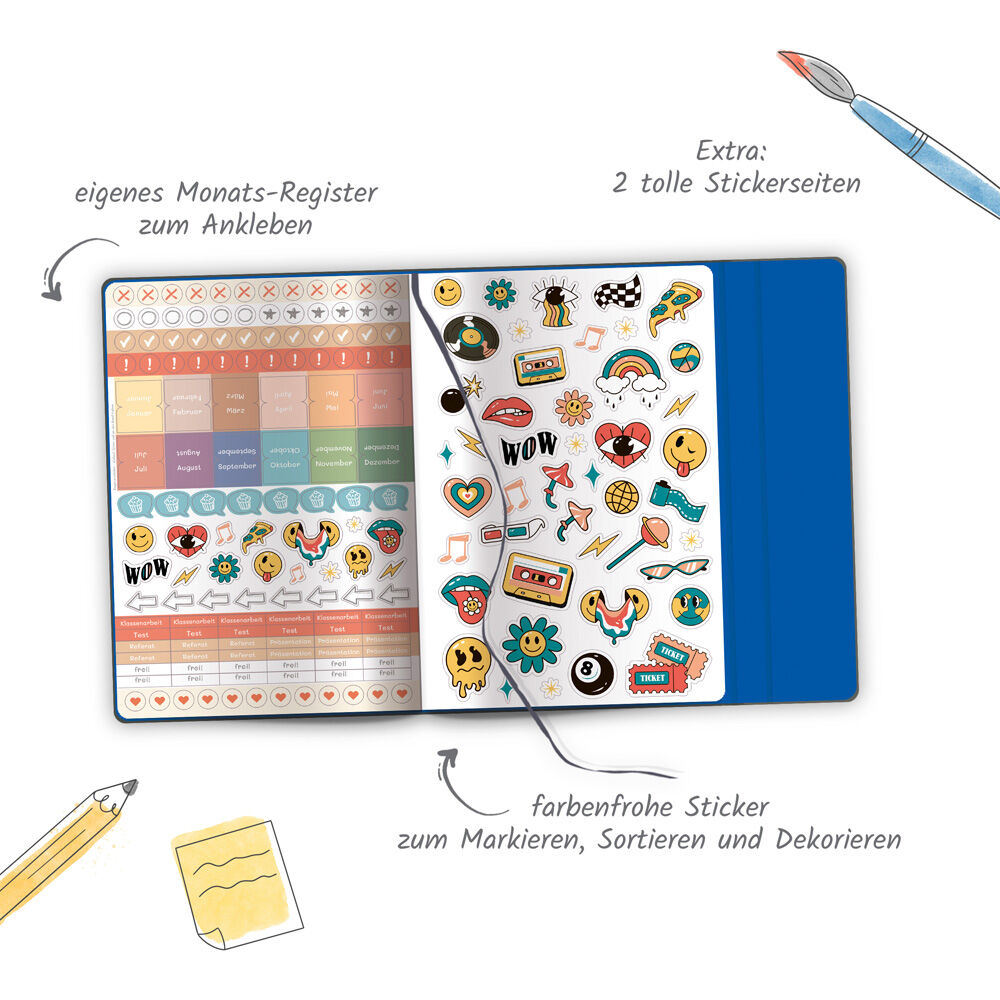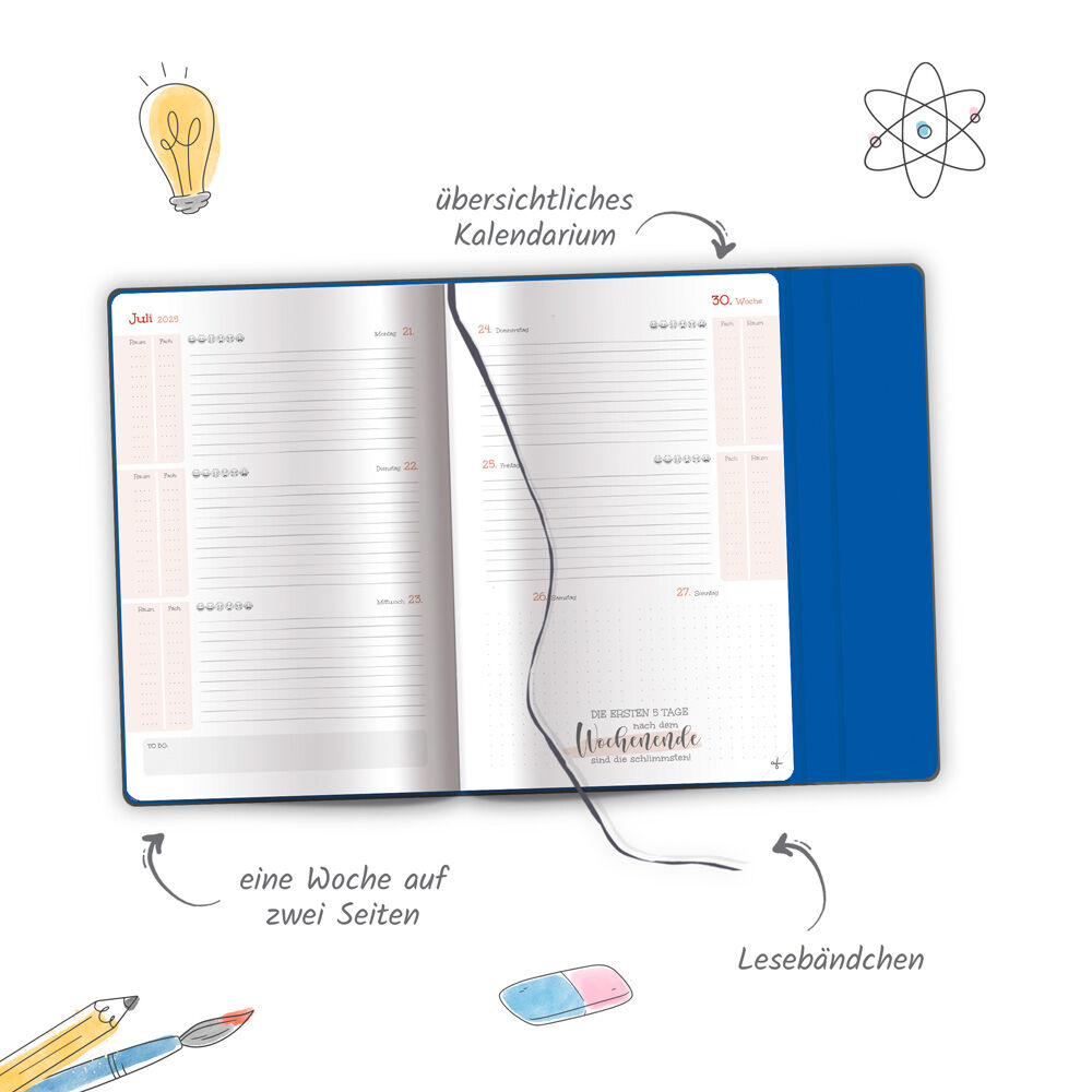 Der minimalistische Hardcover-Schülerkalender für das Schuljahr 2025/26 ist mit einer Magnetklappe verschließbar. Er ist ca. 14 x 18 cm groß und bietet auf 128 Seiten genügend Platz für wichtige Notizen und Termine. Für Stundenpläne, Noten, Schulferien, Adress...