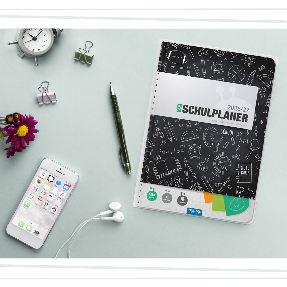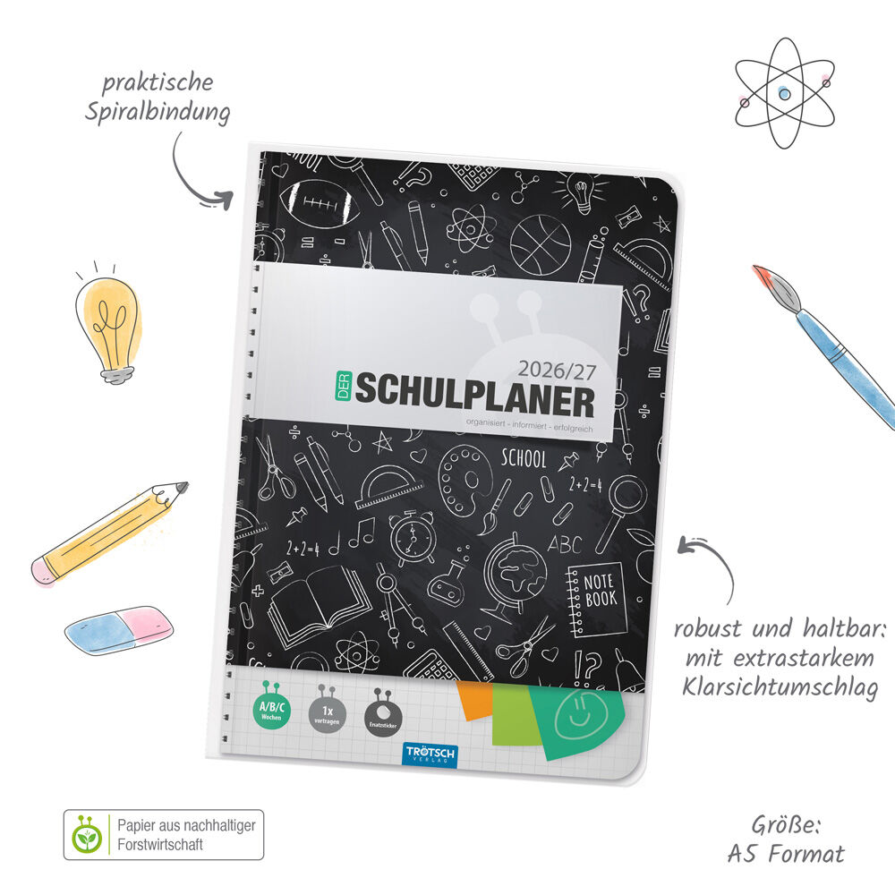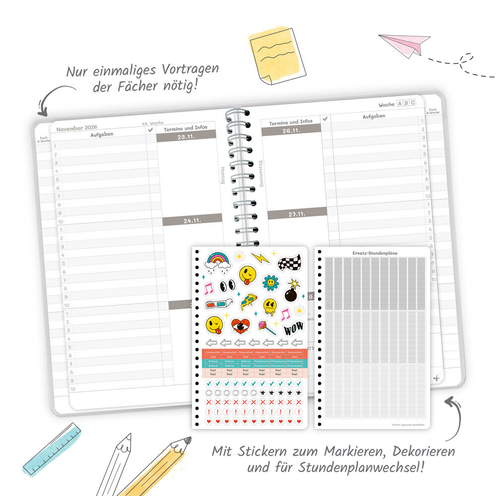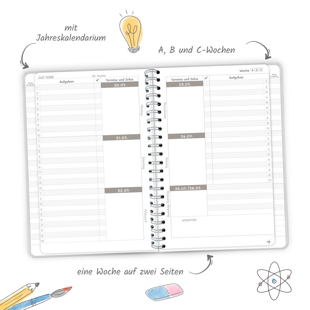 Der Schulplaner im DIN A5 Format mit extrastarkem Klarsichtumschlag ist mit einer Spiralbindung versehen, wodurch die Seiten leicht umgeblättert werden können. Auf einer Doppelseite pro Woche mit Kalendarium gibt es ausreichend Platz zum Eintragen von Aufgaben...