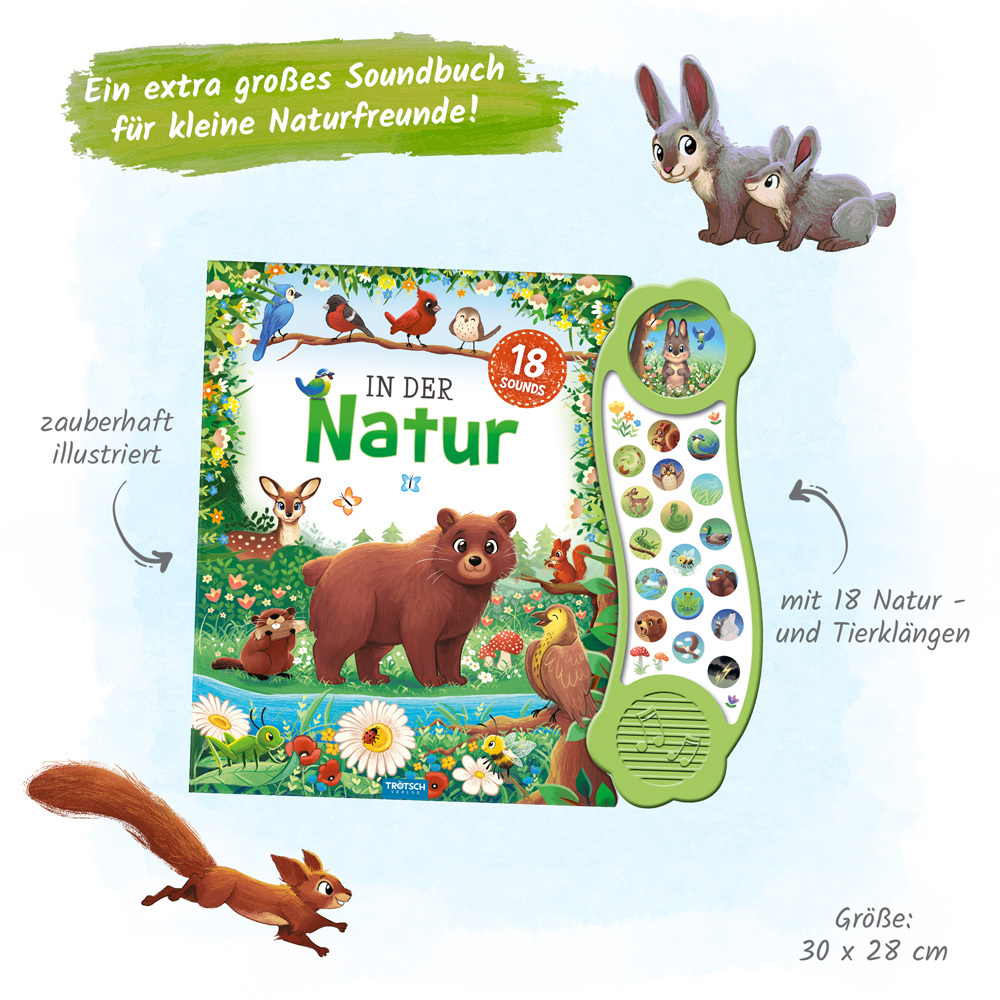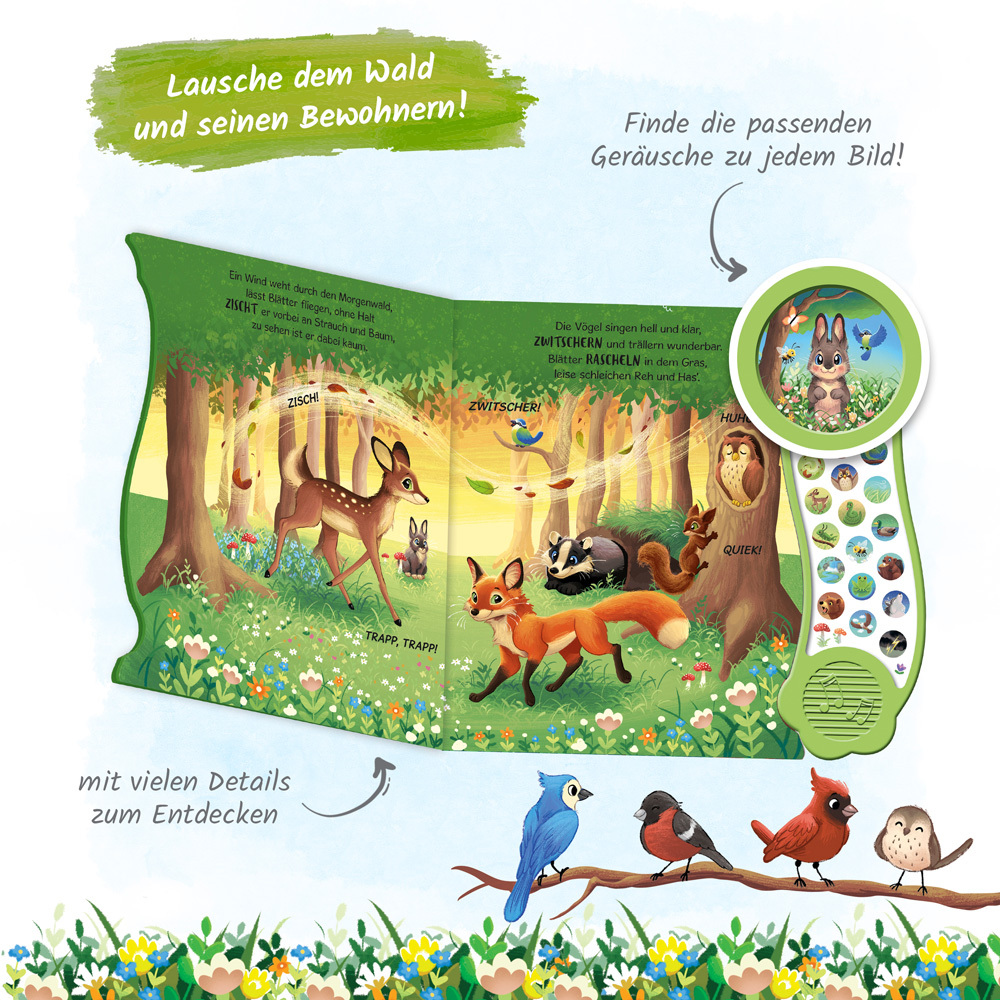 Wer zirpt denn da im Gras? Wer zwitschert im Baum? Und wer heult in der Nacht? Dieses extra große Soundbuch lädt mit 18 verschiedenen Klängen auf Entdeckungsreise durch die Natur ein und bringt die Geräusche von Wald und Flur ins eigene Kinderzimmer! Zauberhaf...