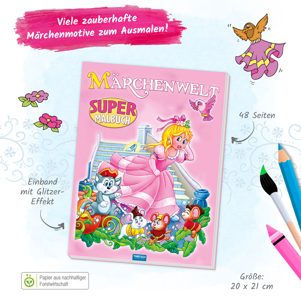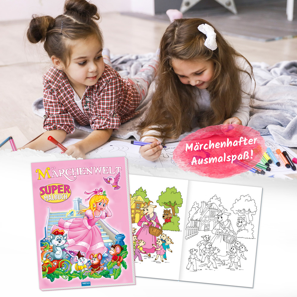 TRÖTSCH - Supermalbuch Märchenwelt | Zauberhaftes Malbuch mit 48 farbigen Malvorlagen beliebter Märchenfiguren. Ausmalbuch für Buntstifte, Wasserfarben und Wachsmalstifte | Ab 3 Jahren
