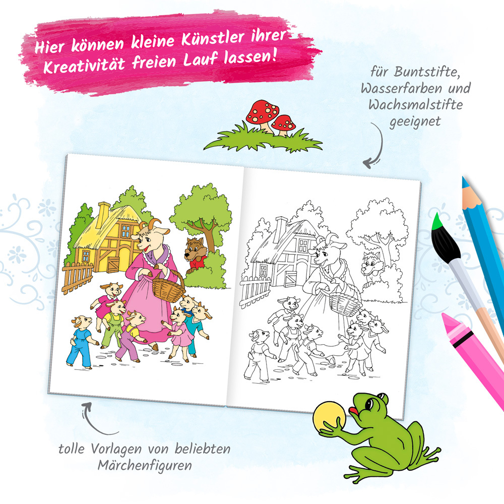 Auf die Stifte, fertig, los! Dieses zauberhafte Malbuch lädt mit zahlreichen Motiven allseits beliebter Figuren in die wunderbare Welt der Märchen ein. 48 Vorlagen garantieren jede Menge Ausmalspaß für große und kleine Märchenfans!