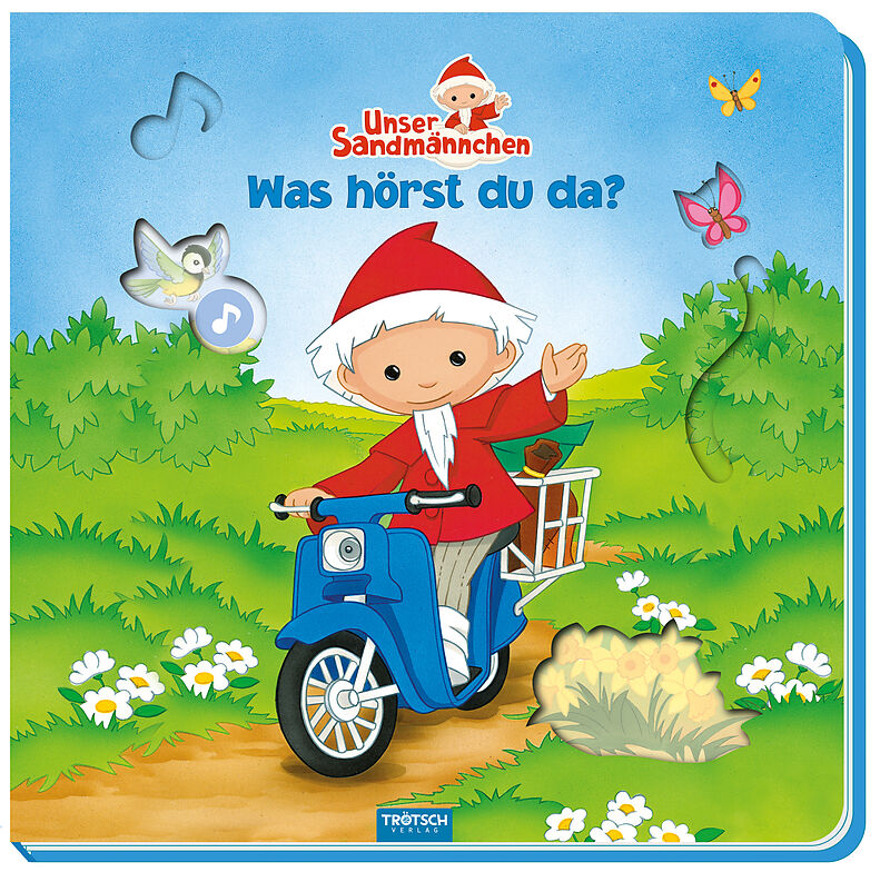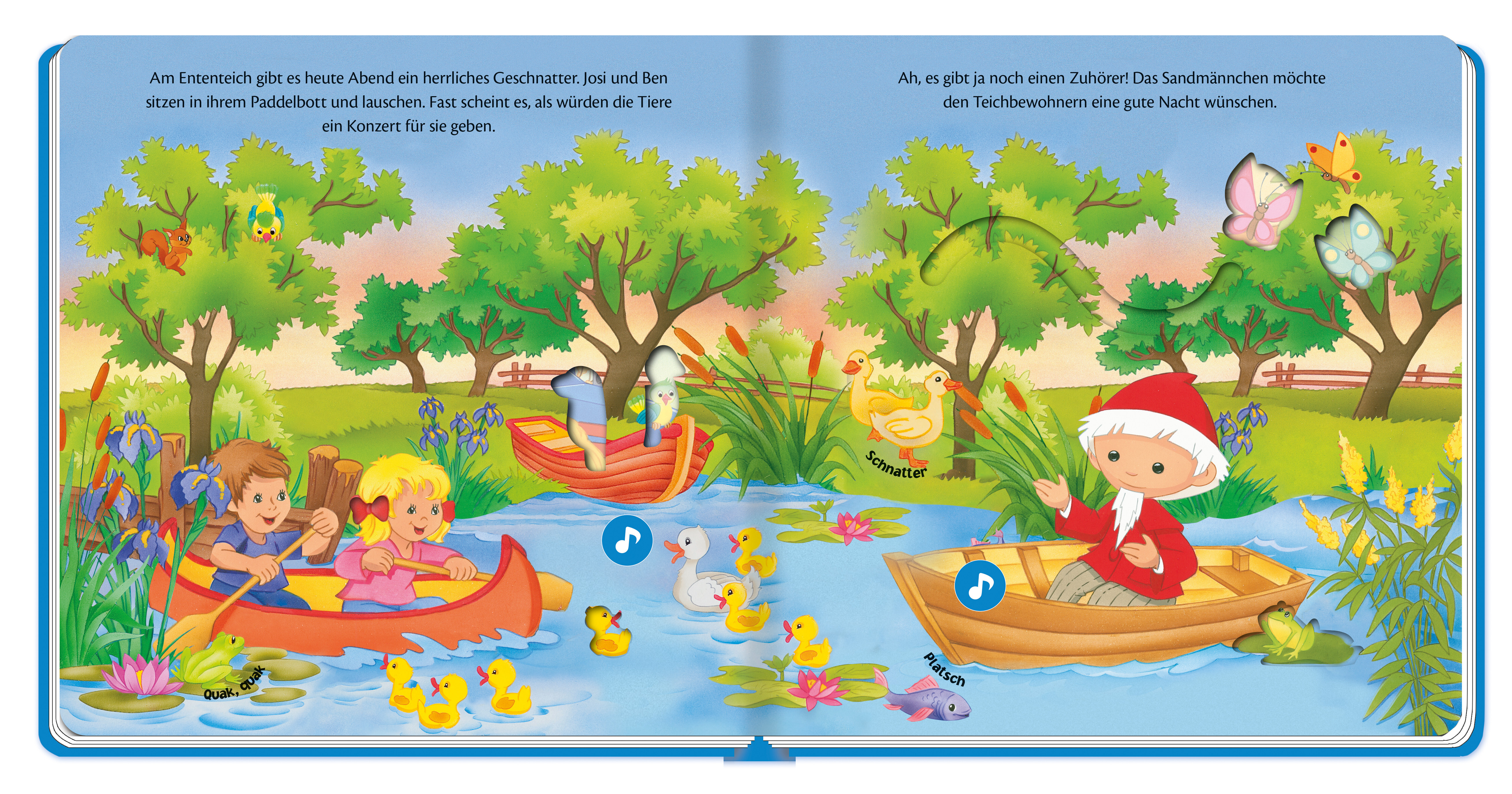 Fünf fröhliche Bildergeschichten vom Sandmännchen auf seinen Reisen. Zum Anschauen, Hören und Staunen. Zu jeder Geschichte ertönt ein neuer Sound, wenn man dem auf die markierten Felder drückt. Insgesamt 10 Sounds mit An- und Ausschaltfunktion. Batteriewechsel...