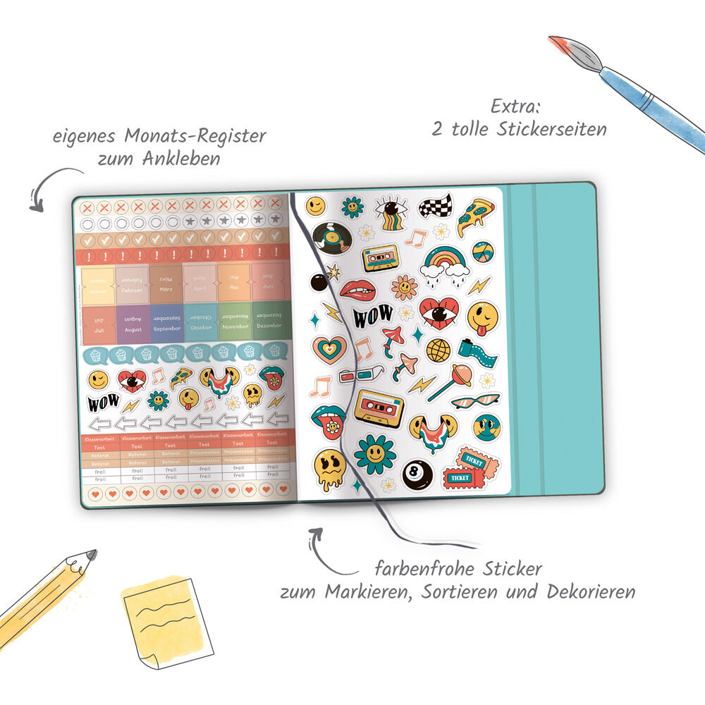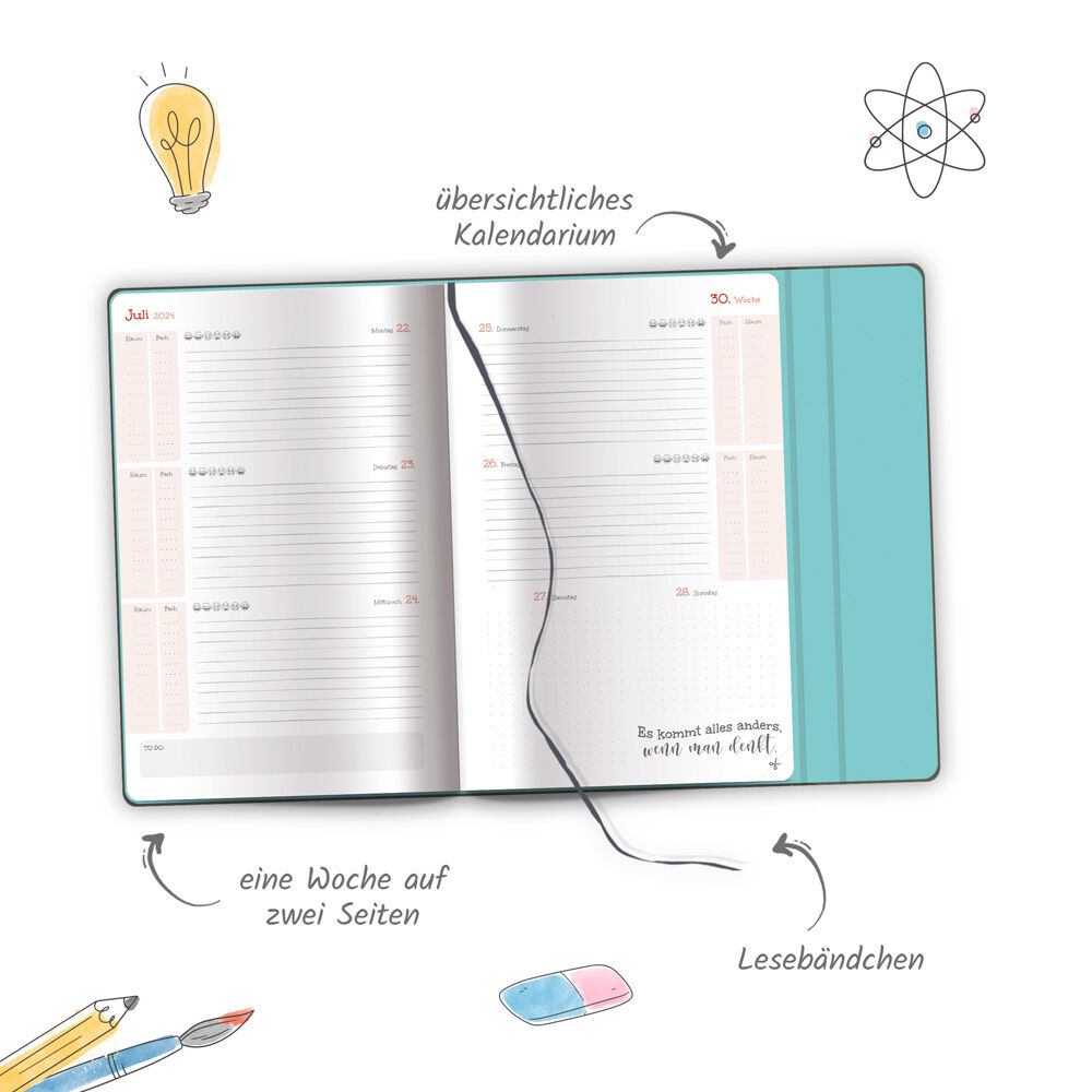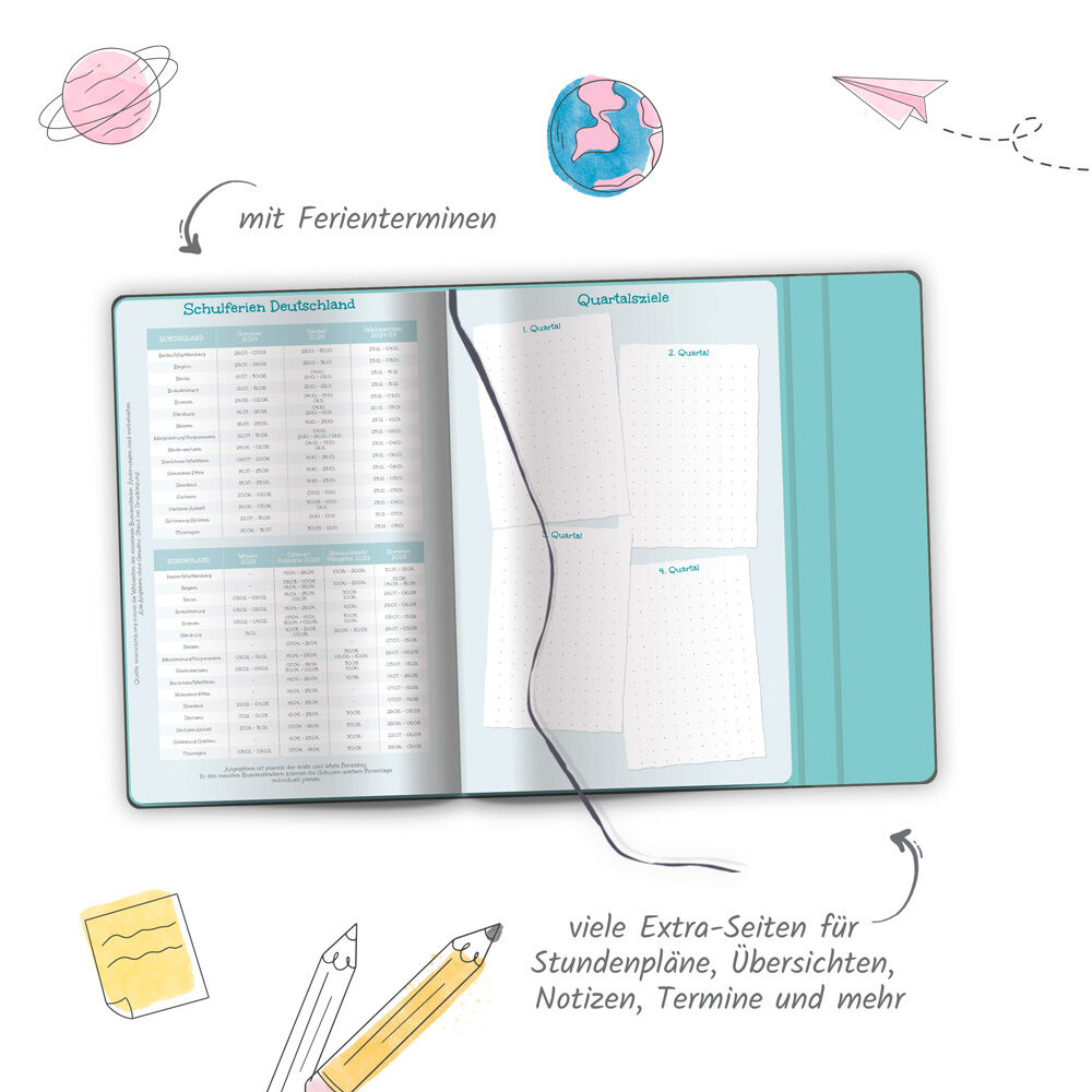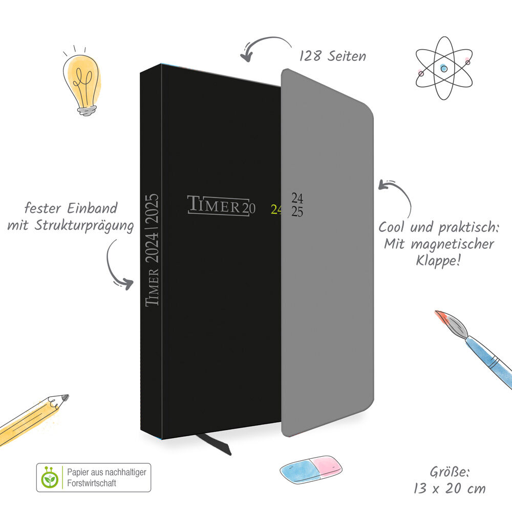 Der minimalistische Hardcover-Schülerkalender für das Schuljahr 2024/25 ist mit einer Magnetklappe verschließbar. Er ist ca. 14 x 18 cm groß und bietet auf 128 Seiten genügend Platz für wichtige Notizen und Termine. Für Stundenpläne, Noten, Schulferien, Adress...