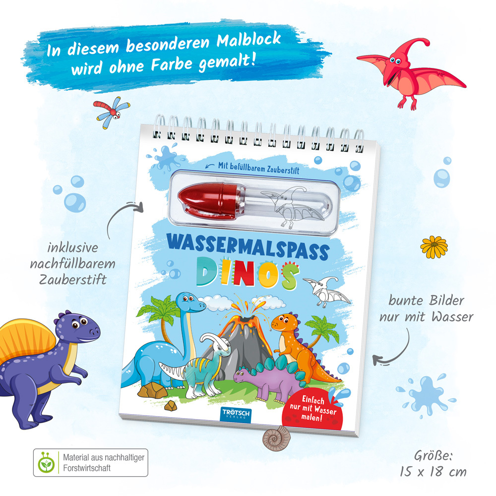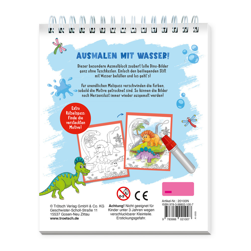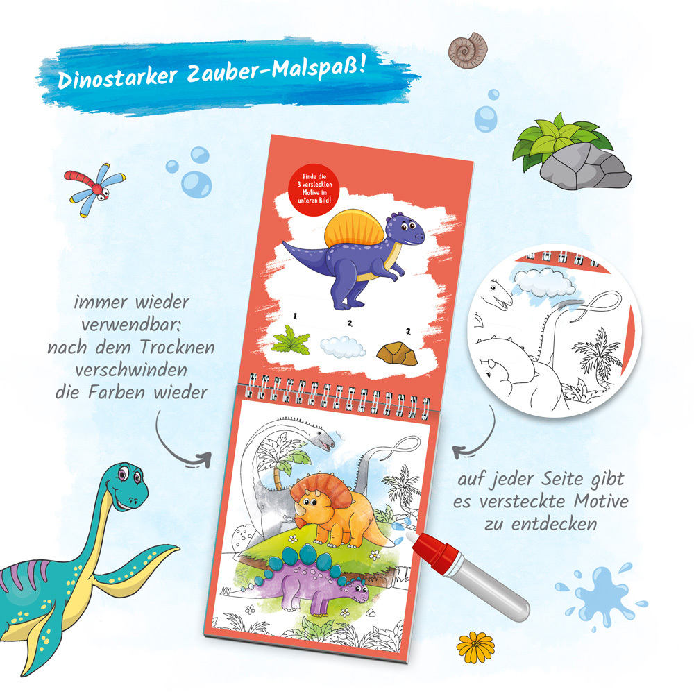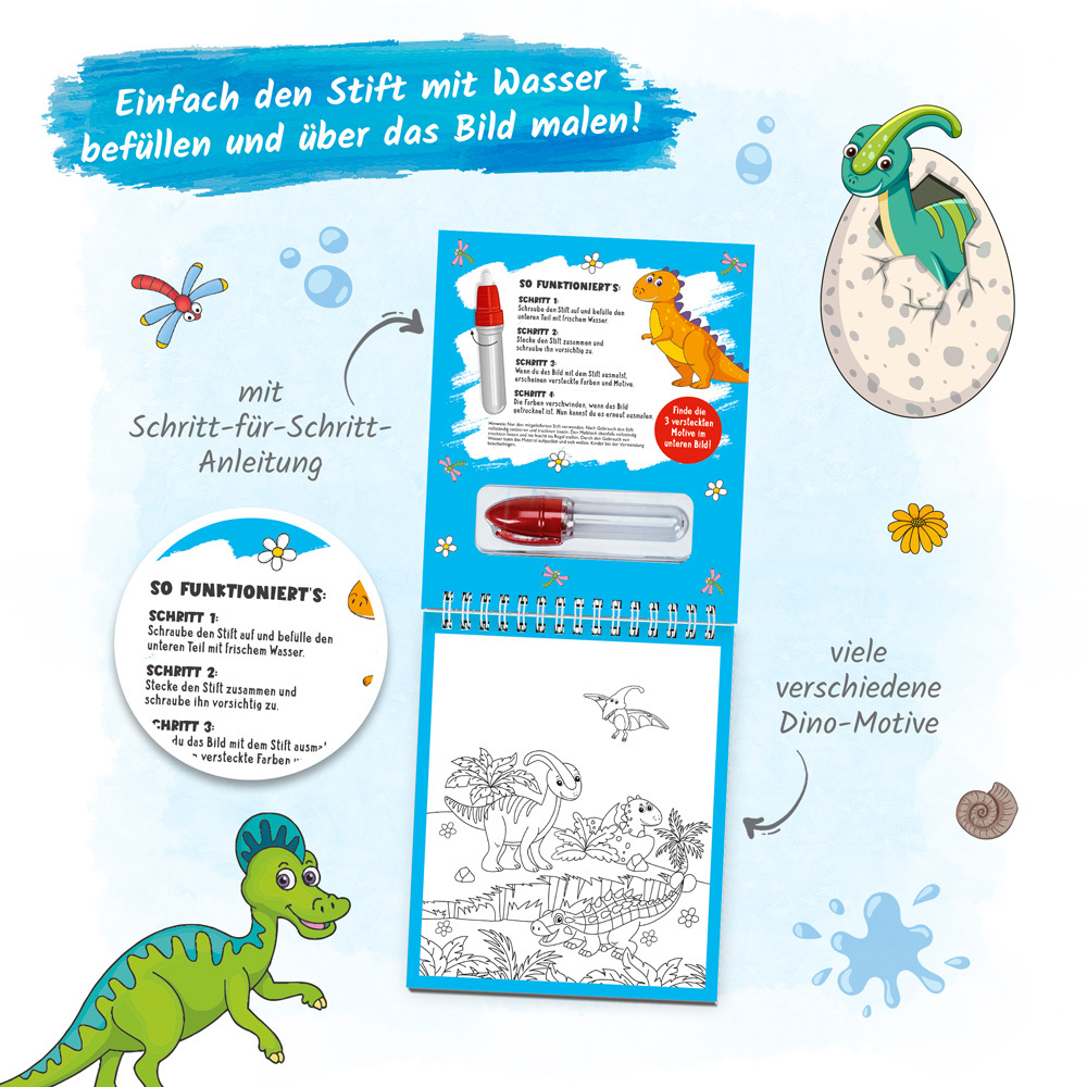 Mit Wasser malen wie von Zauberhand! Dieser besondere Ausmalblock hält dinostarke Motive und Rätsel auf jeder Seite bereit. Kleine und große Dino-Fans kommen dabei ganz ohne Tuschkasten oder zusätzliche Stifte aus! Einfach den beiliegenden Zauberstift mit Wass...