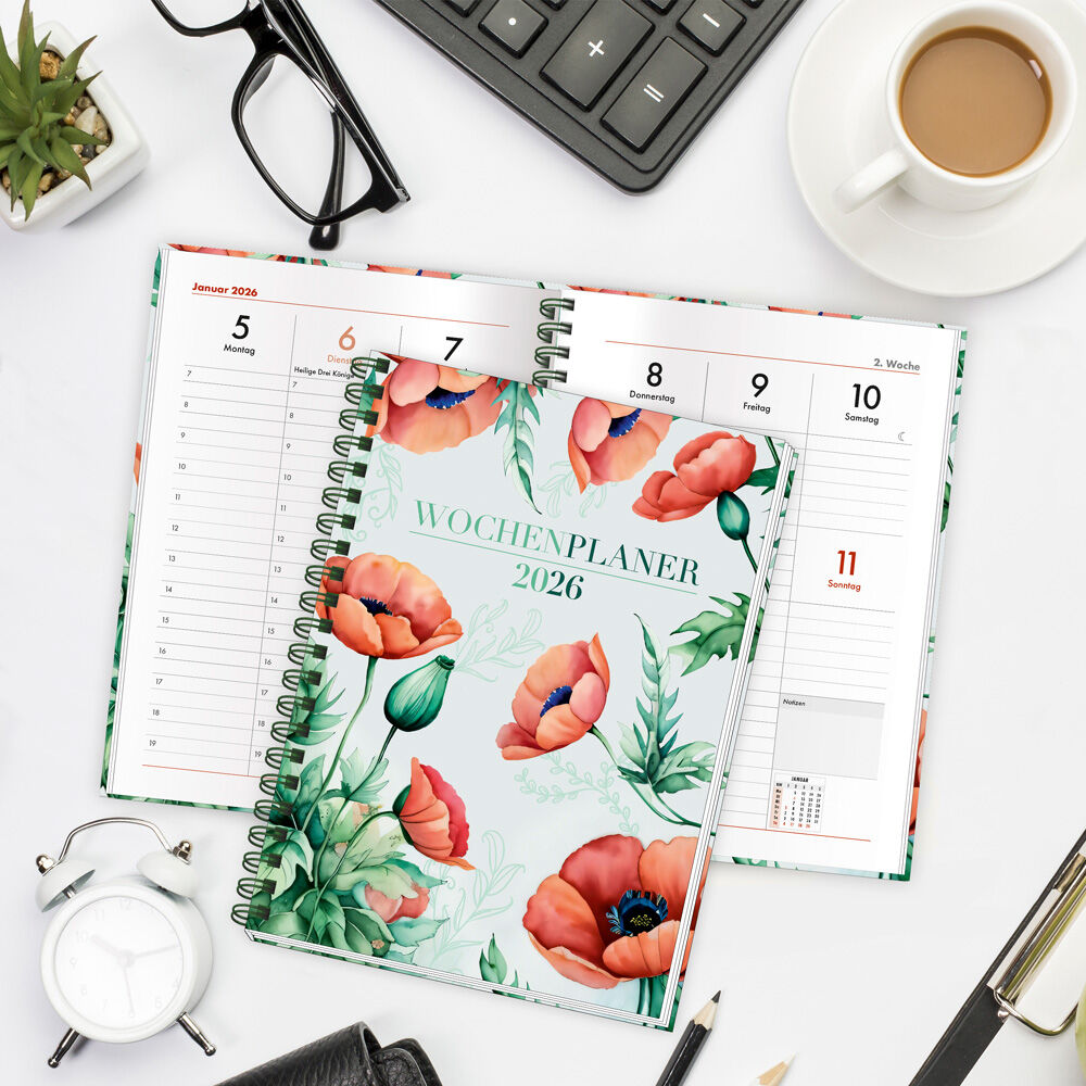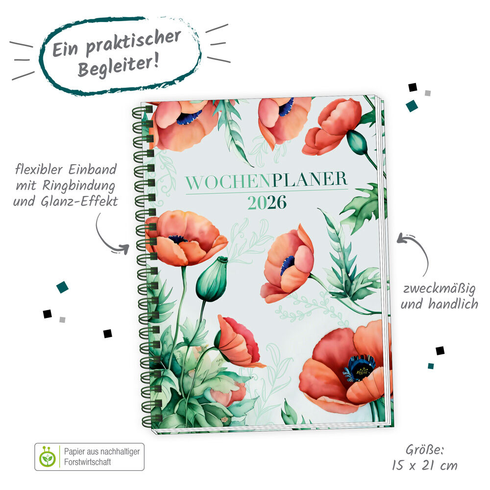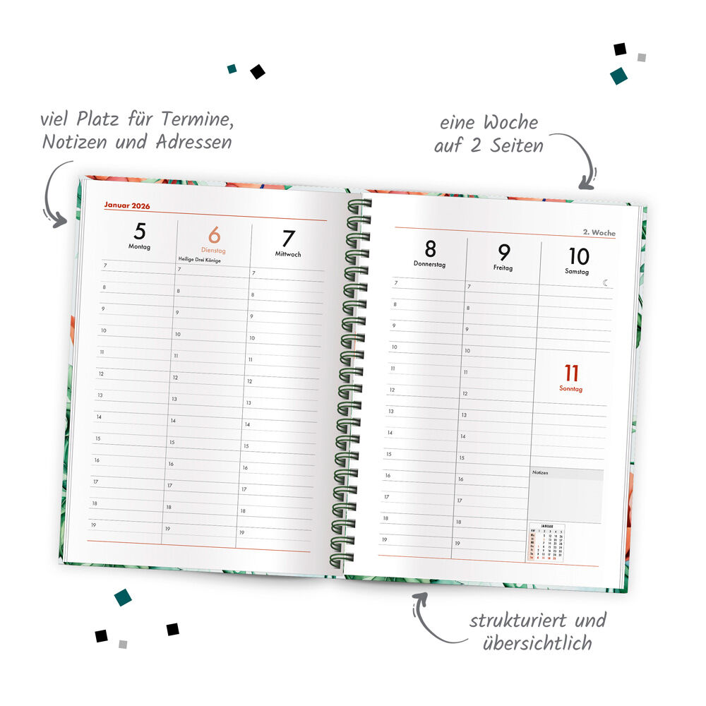 Dieser wunderschöne Wochenplaner mit Ringbindung überzeugt mit einem zauberhaften floralen Design. Die übersichtliche Wochenansicht auf zwei Seiten bietet viel Platz zum Eintragen und Strukturieren von Terminen und Aufgaben. Dank Jahresübersicht, international...40 Kunden haben diesen Artikel kürzlich gekauft.