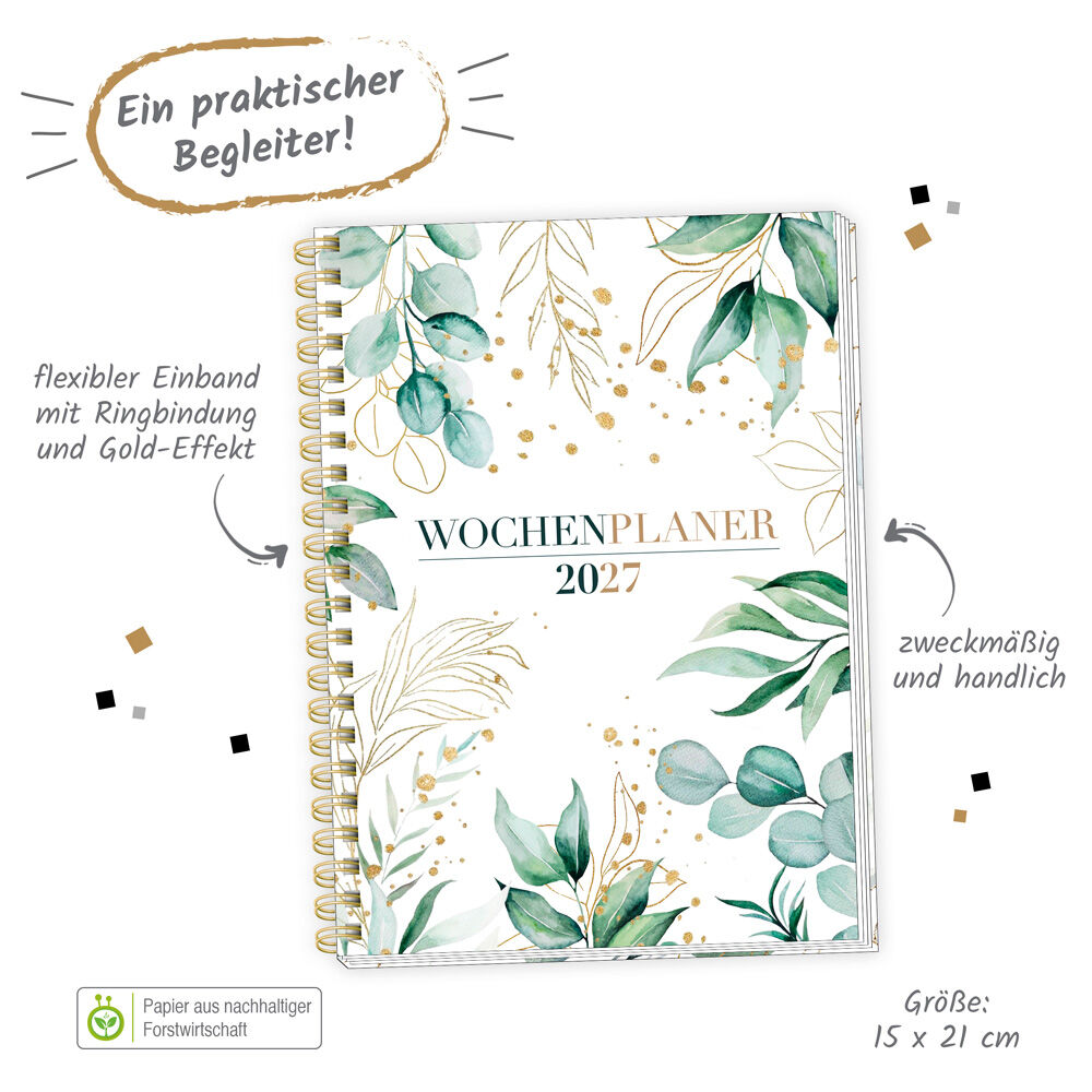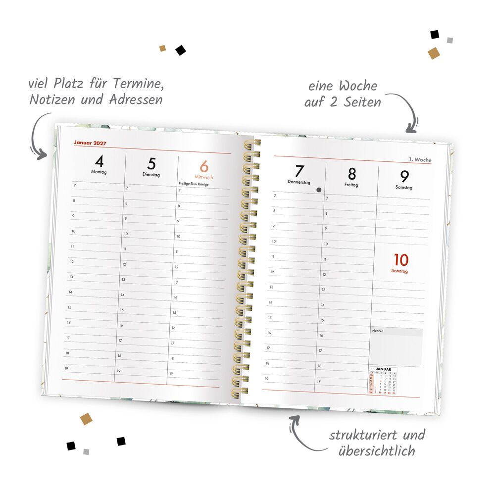 Dieser wunderschöne Wochenplaner mit Ringbindung überzeugt mit einem zauberhaften Design. Die übersichtliche Wochenansicht auf zwei Seiten bietet viel Platz zum Eintragen und Strukturieren von Terminen und Aufgaben. Dank Jahresübersicht, internationaler Telefo...