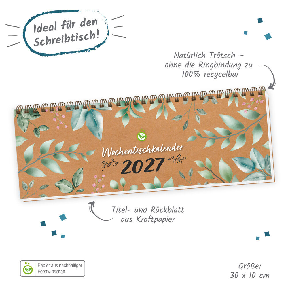 Praktischer Schreibtischquerkalender, damit Sie keinen Termin vergessen. Mit viel Platz für Erinnerungen, Termine und Notizen. Inklusive Urlaubsplanung, Geburtstagskalender, Umwelttipps und Alltagshelfer für unterwegs. Das Kraftpapier-Cover ist ein besonderer ...