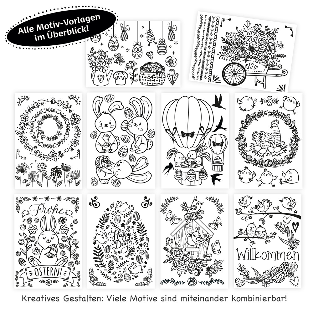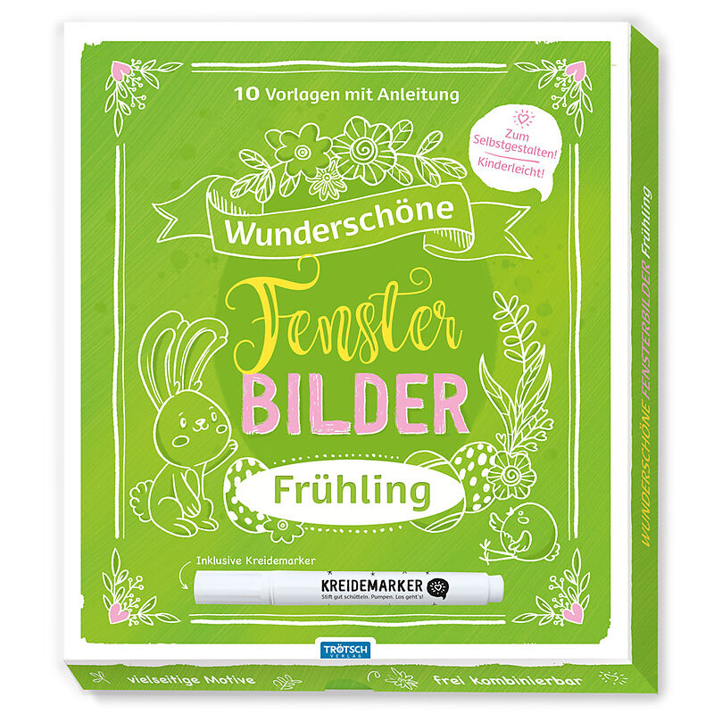 Wunderschöne Fensterdeko für viele Anlässe zum Selbstgestalten! Die Motive werden mit dem Kreidestift ganz einfach auf die Fensterscheibe übertragen. Der Stift ist rückstandslos entfernbar. Für Fenster, Vitrinen und alle anderen glatten Glasflächen!