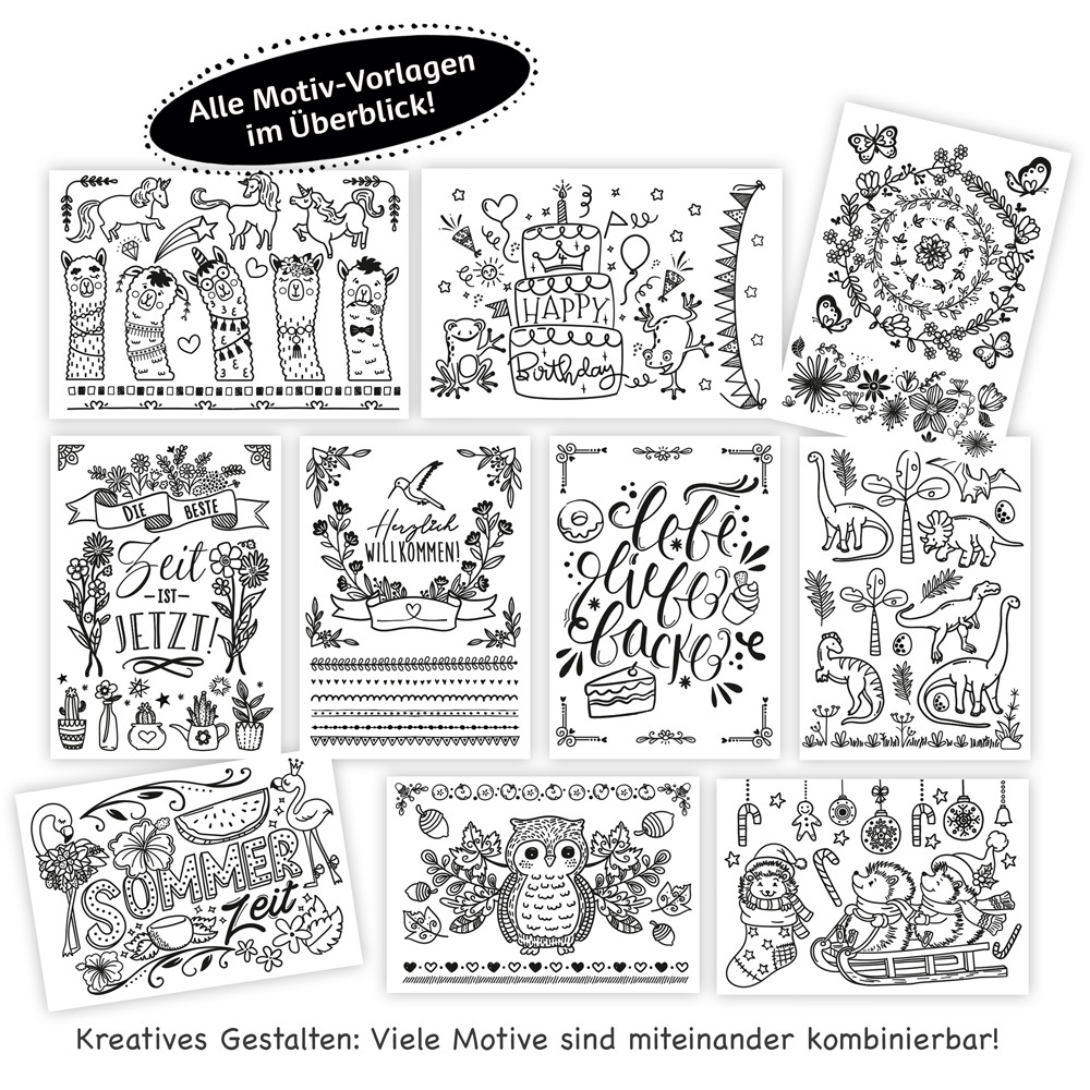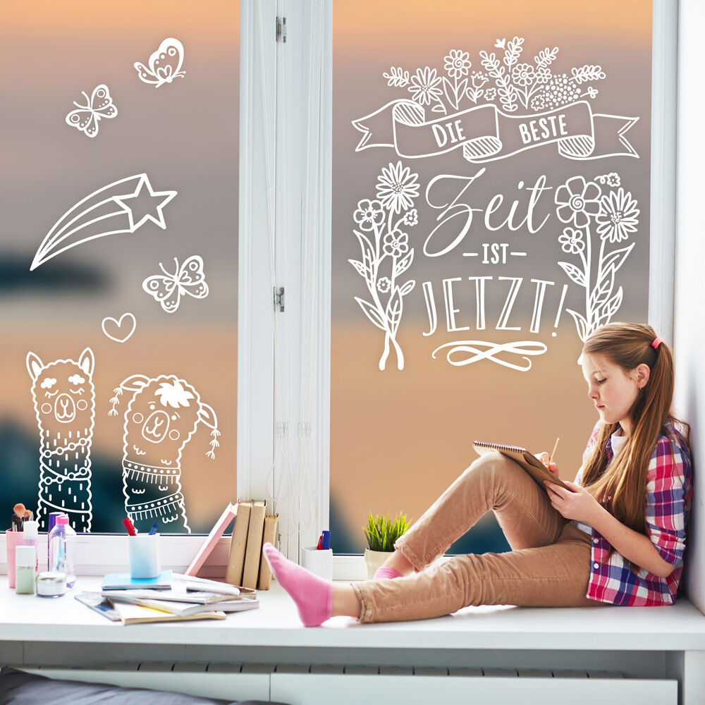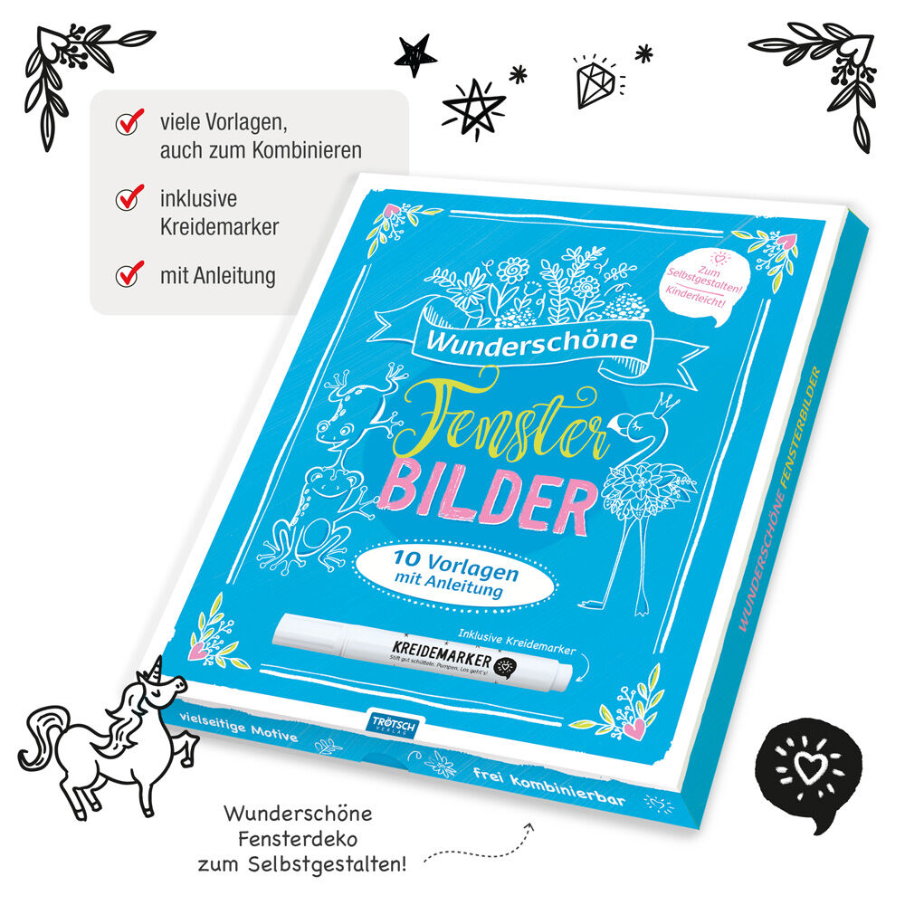 Wunderschöne Fensterdeko für viele Anlässe zum Selbstgestalten! Die Motive werden mit dem Kreidestift ganz einfach auf die Fensterscheibe übertragen. Der Stift ist rückstandslos entfernbar. Für Fenster, Vitrinen und alle anderen glatten Glasflächen!