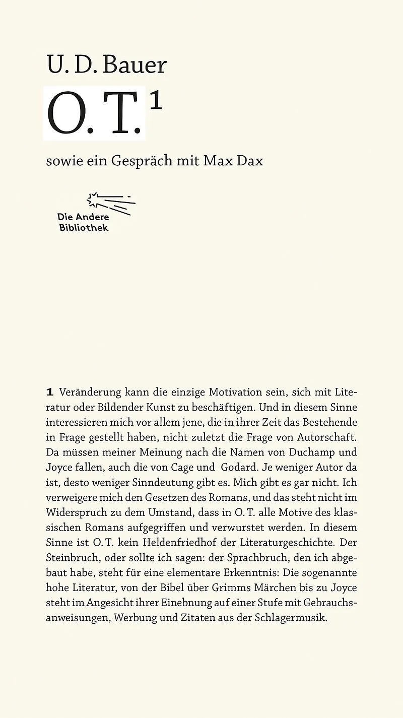»U.D. Bauer reiht in ihrem Romandebüt wie in einem komplexen Sudoku Zitat an Zitat und schneidet die Welt in über dreitausend Ebenen. O.T. begegnet der Willkür unserer digitalen Welt mit der robusten Verbindlichkeit der Literatur. Ein Glücksfall!« Alexander Kl...