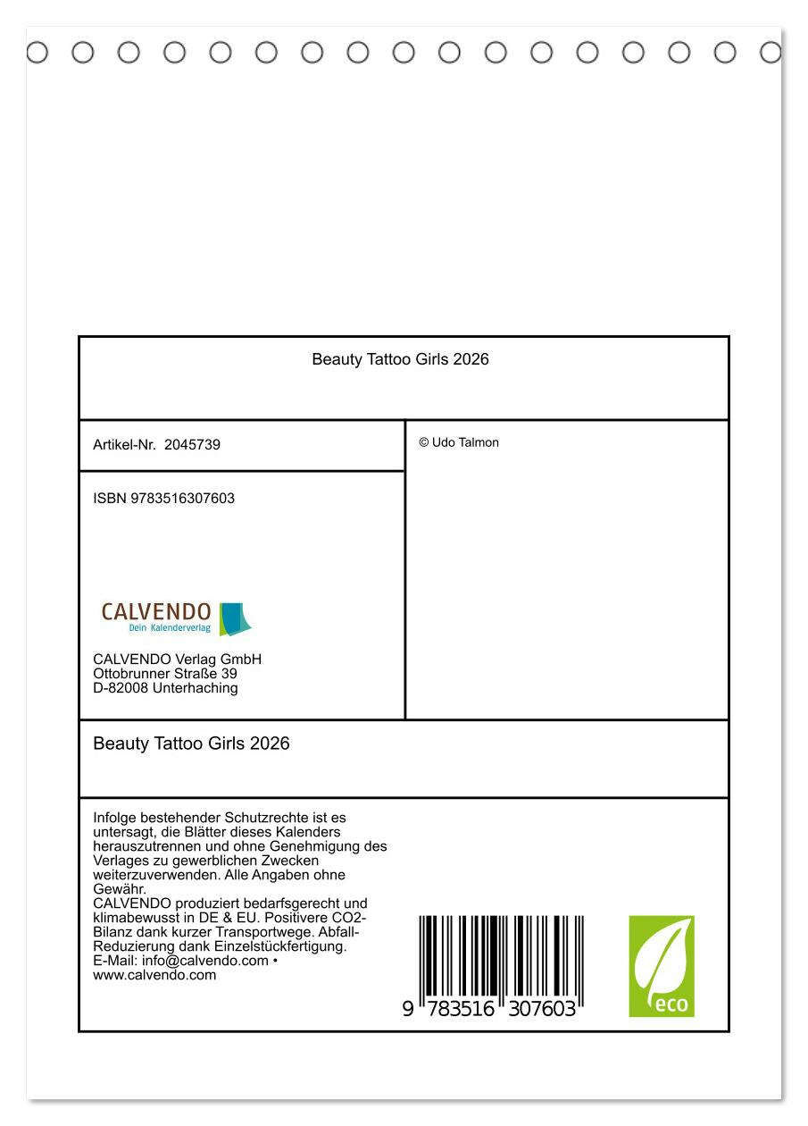 Beauty Tattoo Girls 2026 (Tischkalender 2026 DIN A5 hoch), CALVENDO Monatskalender