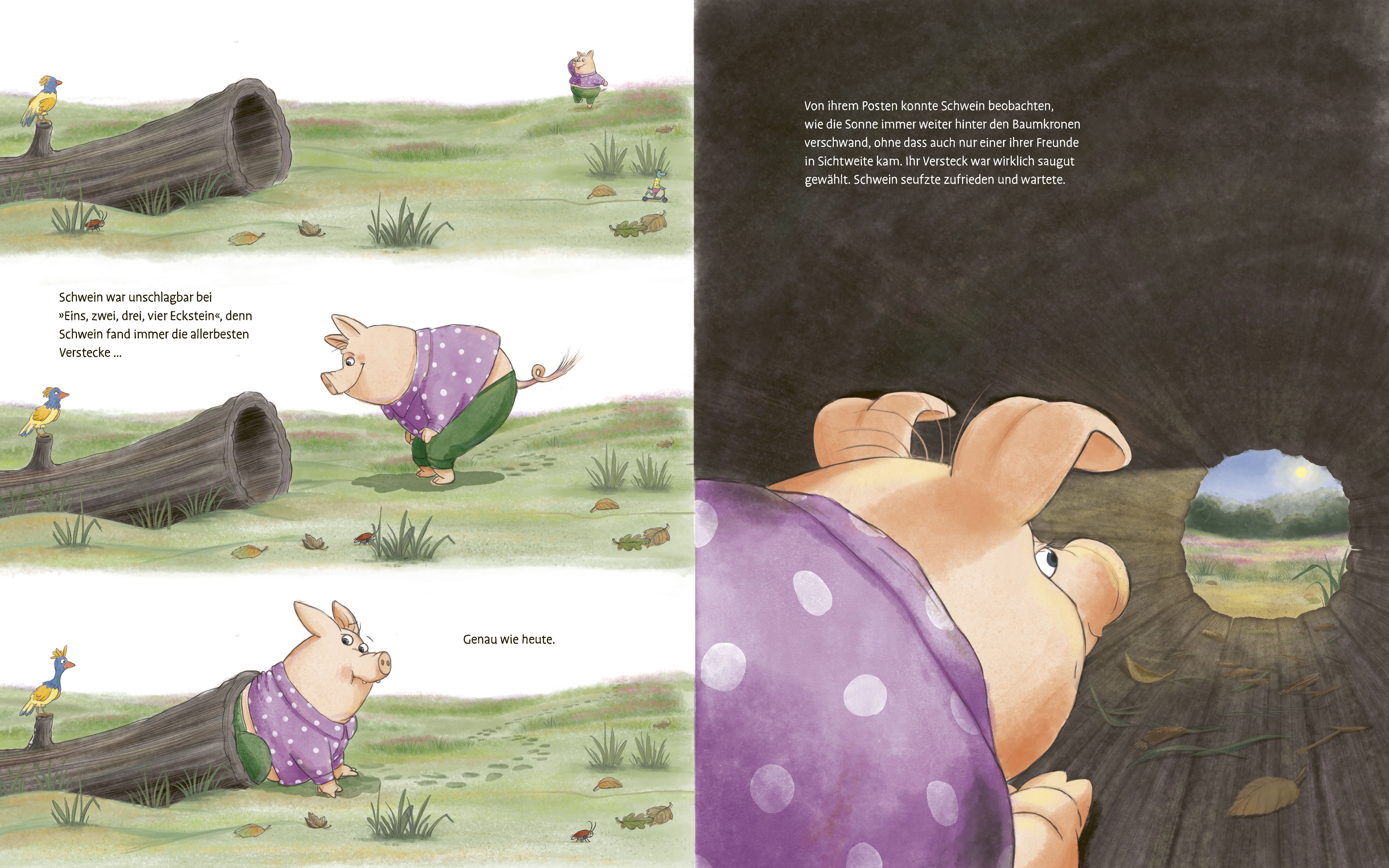Schwein und Bär zwei schräge Protagonisten und eine ungewöhnliche Freundschaft Beim Versteckspielen bleibt Schwein in einem Baumstamm stecken. Die Tiere versuchen vergeblich, das festsitzende Schwein zu befreien. Selbst Bär mit seiner Bärenstärke kann nicht h...