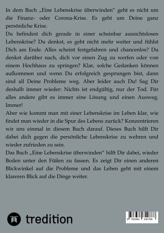 In dem Buch Eine Lebenskrise überwinden geht es nicht um die Finanz- oder Corona-Krise. Es geht um Deine ganz persönliche Krise. Du befindest dich gerade in einer scheinbar aussichtslosen Lebenskrise? Du denkst, es geht nicht mehr weiter und fühlst Dich am End...