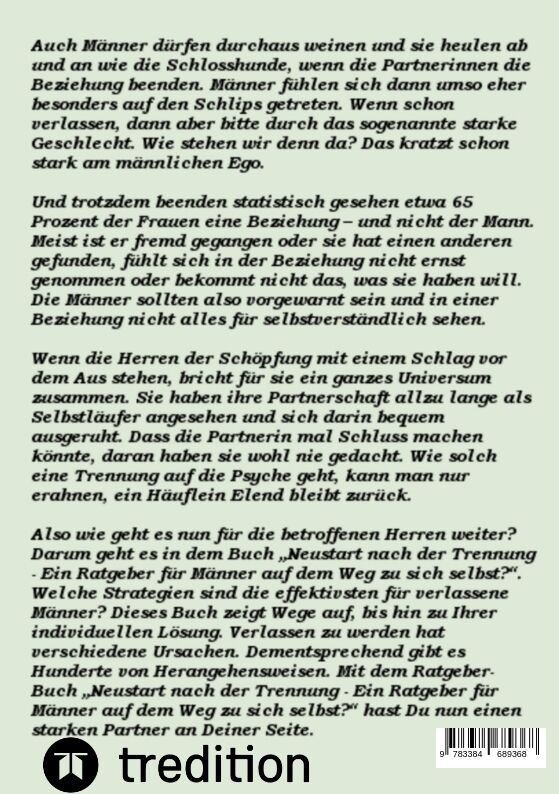 Das Buch Neustart nach der Trennung Ein Ratgeber für Männer auf dem Weg zu sich selbst ist ein einfühlsamer Begleiter für Männer, die nach einer Trennung nicht nur ihre Beziehung, sondern auch ein Stück ihrer Identität verloren haben. Es geht um mehr als Liebe...