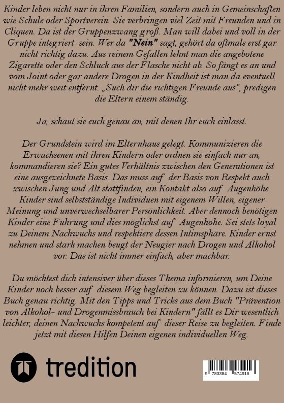 Du möchtest dich intensiver über dieses Thema informieren, um Deine Kinder noch besser auf diesem Weg begleiten zu können. Dazu ist dieses ebook genau richtig. Mit den Tipps und Tricks aus dem Buch "Prävention von Alkohol- und Drogenmissbrauch bei Kindern" fäl...
