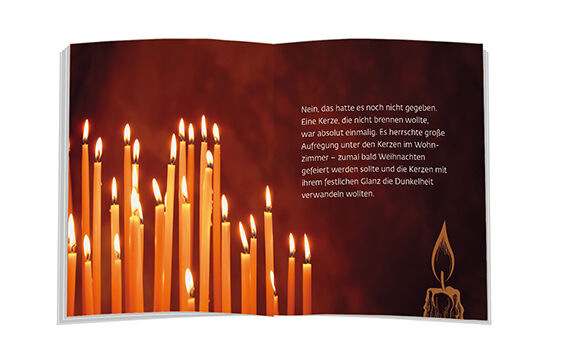 Die kleine Kerze, die nicht brennen will, überwindet ihre Furcht und findet so zu ihrer eigentlichen Bestimmung. Sie verbreitet Licht und Freude und die Gewissheit, dass Geben seliger ist als Nehmen.