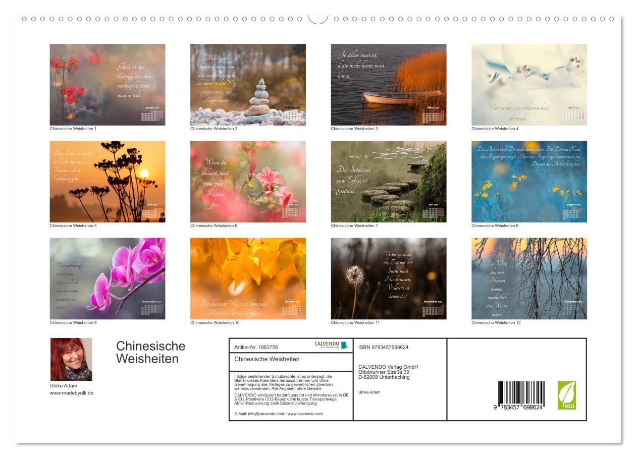 Lassen Sie sich durch Lebensphilosophien aus China zum Nachdenken anregen und inspirieren. Versuchen Sie Erkenntnisse für Ihr eigenes Leben zu gewinnen und genießen Sie dabei die wunderschönen Fotografien von Ulrike Adam, Siegerin des "European Garden Photogra...