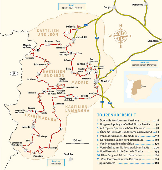 EINLADUNG Spanien ist seit vielen Jahren eines der beliebtesten Urlaubsziele nicht nur der Deutschen. Viele verbinden damit Sommer, Sonne, Sonnenschein. Doch Spanien hat weitaus mehr zu bieten. Mit diesem WOMO-Reiseführer möchten wir Sie einladen, ins Herz dieses riesigen Landes vorzudringen. Abseits des Massentourismus gibt es neben kulturellen Highlights auch ganz ursprüngliche und unbekannte Seiten der iberischen Halbinsel zu entdecken. Ausgehend von der größten Autonomen Region Spaniens - Kastilien und León werden wir die Kornkammer des Landes durchqueren, abgelegene Dörfer streifen, beeindruckende Burgen und imposante Kathedralen besuchen. Wir wandeln auf den Spuren der Katholischen Könige und lernen die wechselvolle Geschichte der historischen Städte kennen. Madrid ist das pulsierende Herz Spaniens. Diese Stadt müssen Sie erlebt haben! Wie kaum eine andere vereint sie hochkarätige Museen, eine reiche Kulinarik und beeindruckende Architektur. Weiter geht es auf den Spuren großer Entdecker und Konquistadoren in die Extremadura. Naturliebhaber und Gourmets kommen hier auf ihre Kosten. Die schwarzen Schweine und der Bellota-Schinken sind legendär. Entlang der portugiesischen Grenze reisen wir wieder nach Norden und entdecken weitere UNESCO-Weltkulturerbestätten, wie etwa die römische Stadt Mérida. Wir nehmen Sie mit zu Wanderungen in die eindrucksvollen Bergwelten der Sierras, begegnen Geiern, Störchen und Steinböcken. Bei alldem kommen auch die kulinarischen Genüsse nicht zu kurz und wir werden einen Blick in die landestypischen Kochtöpfe werfen. Bodegas, Markthallen, regionale Erzeuger und Restaurants warten auf Ihren Besuch. Auch hier hat Spanien mehr zu bieten als nur Paella und Sangria. Genug Erlebnispotenzial? Dann kommen Sie mit und begleiten Sie uns auf unserer Entdeckungsreise durch die überra- schende, faszinierende und wunderschöne Mitte Spaniens. Hasta luego!
