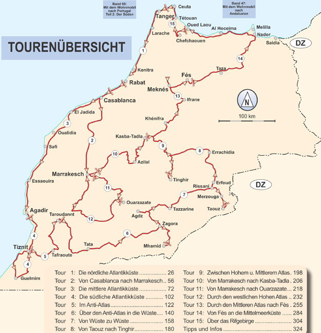 TOURENKARTEN Folgen Sie uns auf 15 sorgfältig recherchierten Touren durch die schönsten und interessantesten Regionen Marokkos. Orientieren Sie sich an den Übersichtskarten zu allen Sehenswürdigkeiten, den Stell- und Campingplätzen und den empfohlenen Reiserou...